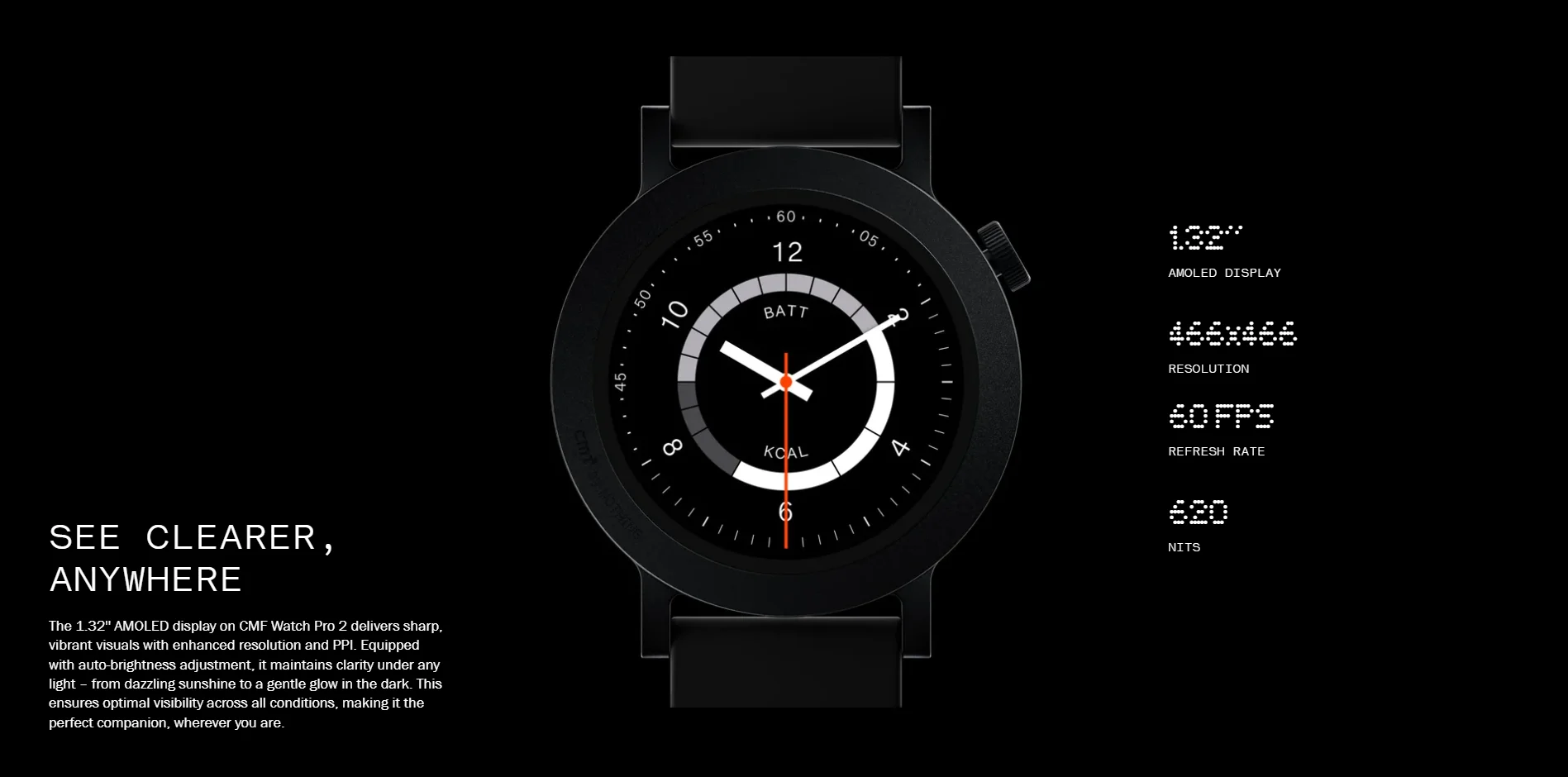 A CMF Watch Pro 2-nek 1,32 inch-es, 466×466 pixel felbontású AMOLED kijelzője van 60 Hz képfrissítési rátával és 620 nit a fényereje. Az óra teljes tömege 48 gramm, igazi kis pehelysúlyú. 305 mAh-s akkumulátora átlagos használat esetén 12 nap, míg intenzív használat és Always-on display mód használata esetén 9 nap üzemidőt ígér. A gyártó adatai szerint körülbelül 17 óra folyamatos Bluetooth hívást és 25 óra GPS használatot tesz lehetővé. A hívásokban az AI funkció is segítségedre lesz, hisz automatikusan szűri a háttérzajokat és tisztítja a beszédhangot.