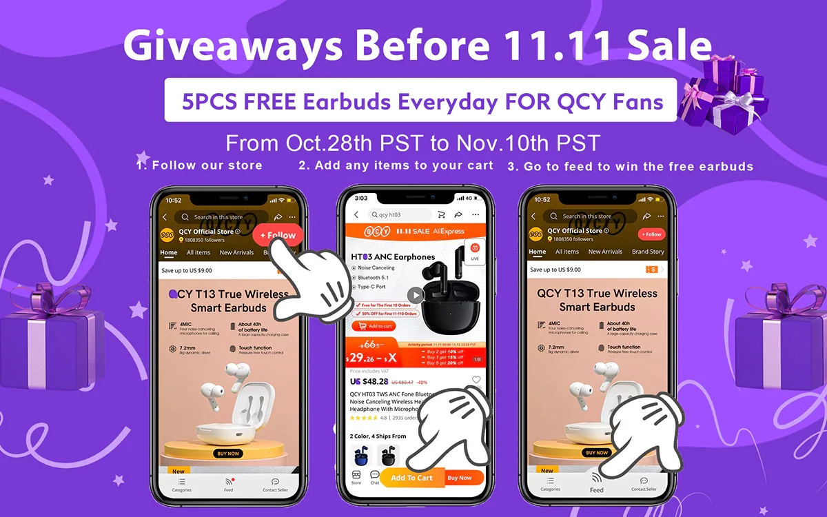 A QCY minden nap 5 darab, naponta változó típusú fülhallgatót (pl. T3, T13, HT01C) ajándékoz a követőinek egészen november 10-ig. Ehhez nem kell mást tennünk, mint a kosárba tenni egy QCY terméket (megvásárolni nem kell), majd miután bekövettük a QCY official store-t Aliexpressen, a mobil applikációban megkeressük őket a Feed menüpont alatt és kommentelünk a nyereményjátékról szóló poszt alá, ezzel jelezve a részvételi szándékunkat. A nyerteseket csakúgy, mint a másik játéknál, az Aliexpresses feedben teszi közzé a store, és üzenetben kell majd jelentkezni a nyereményért.