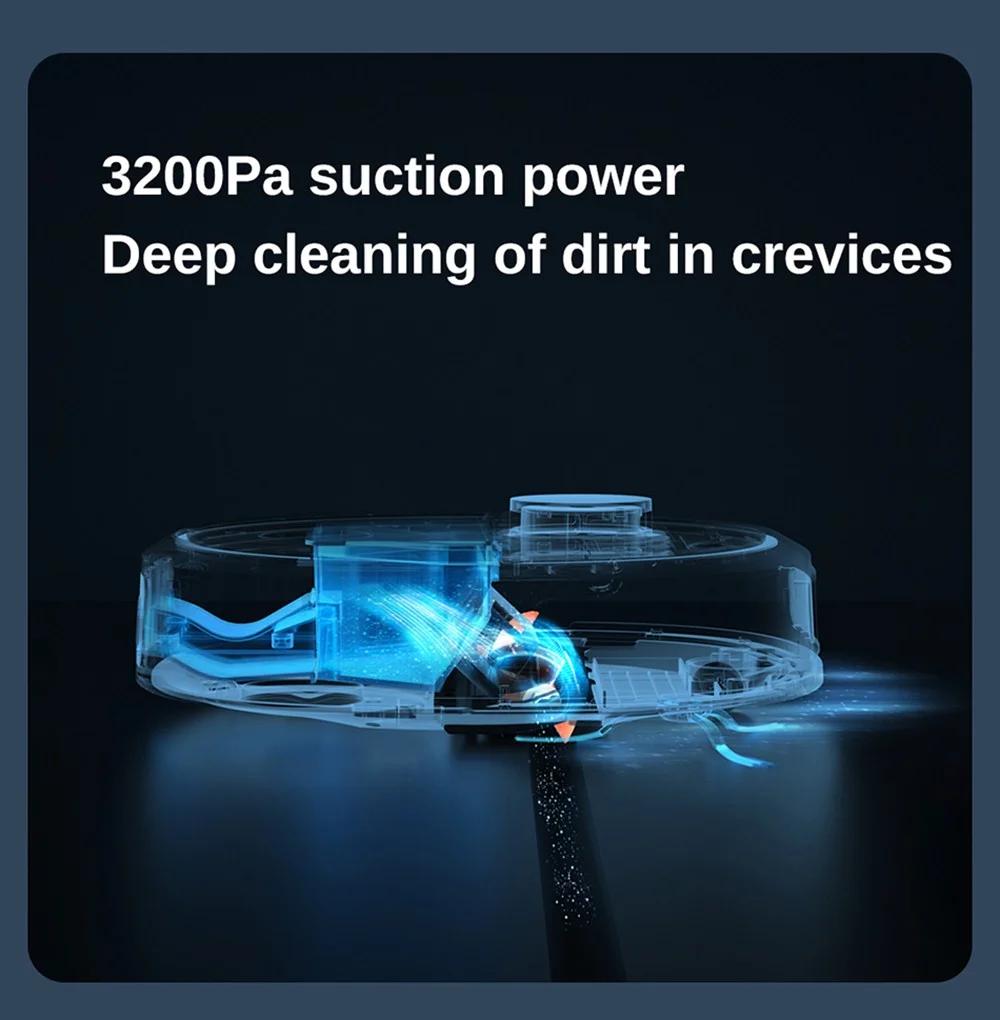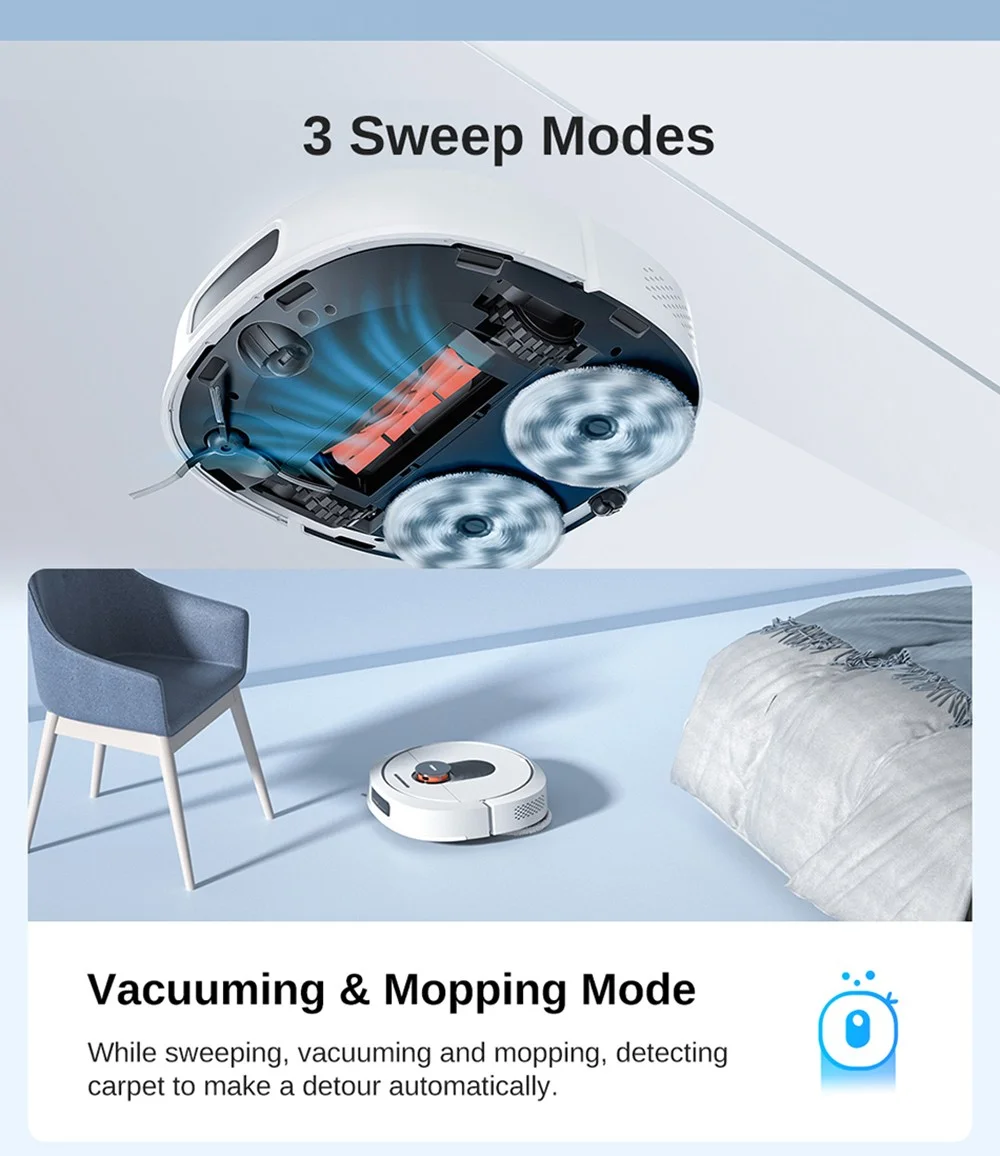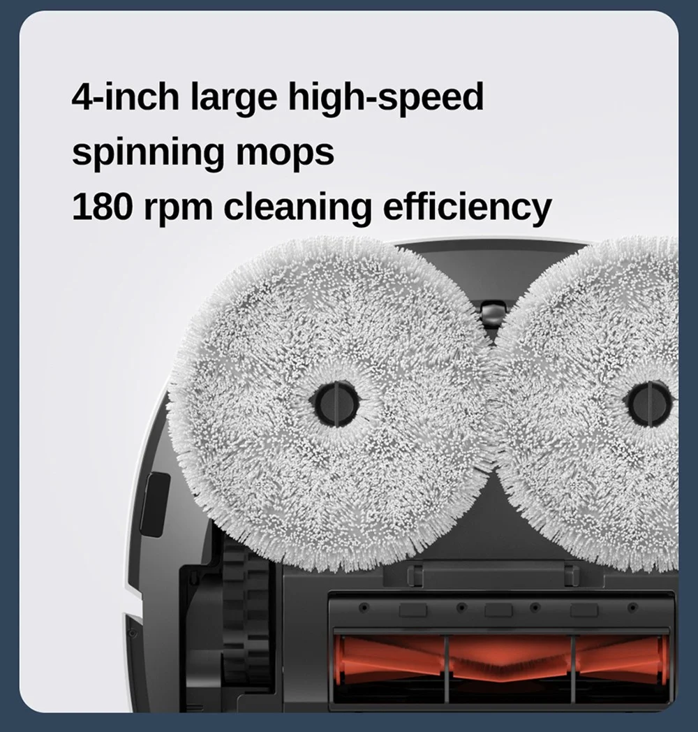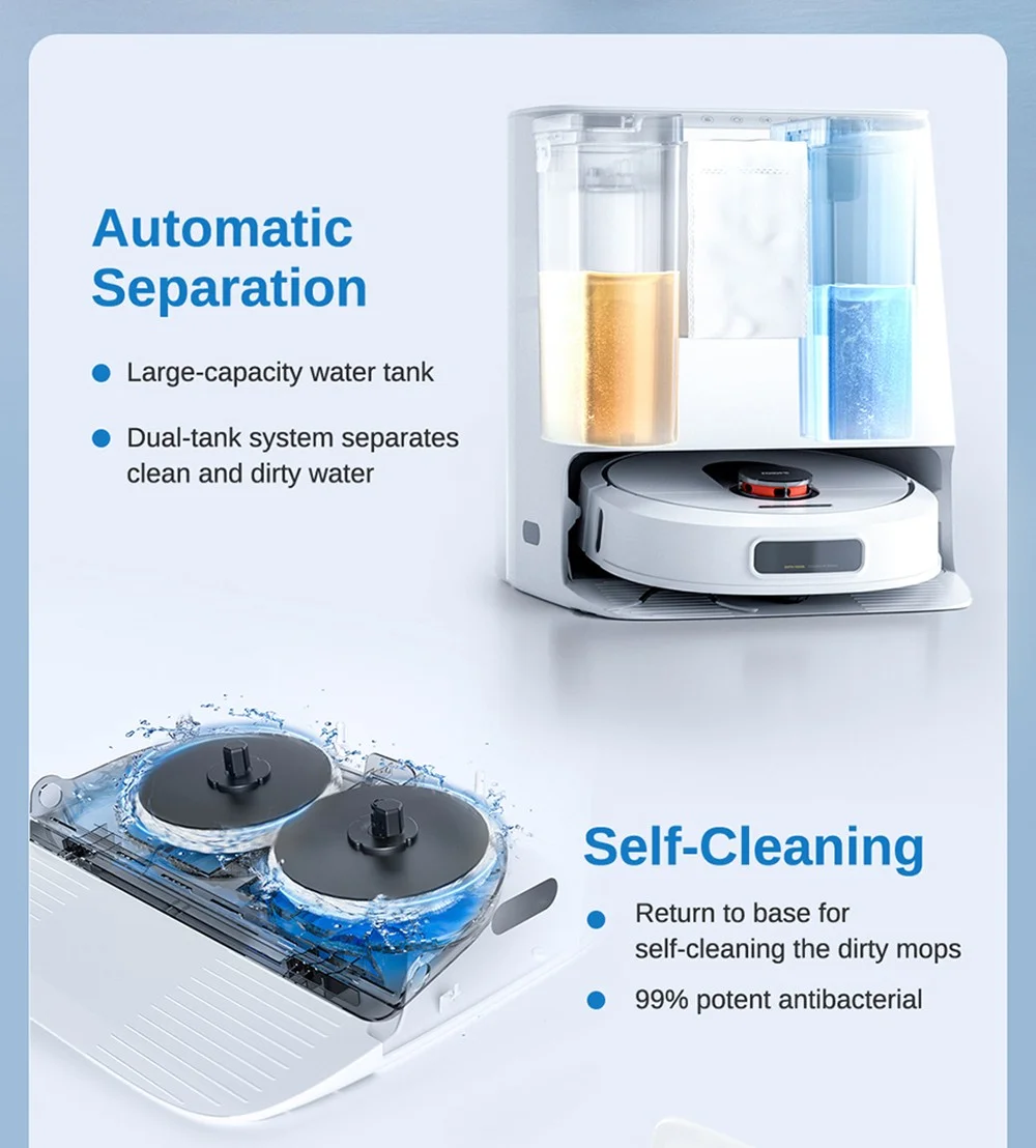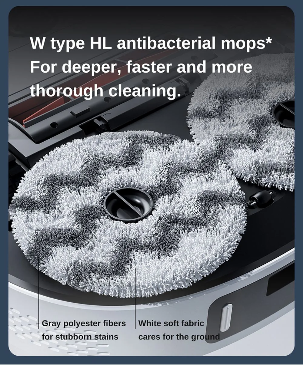 a porszívó formája picit eltér a megszokott kör alaktól, alápillantva szembetűnik, hogy itt nem egy rezegtetett, vagy statikus „felmosórongy” kapott rajta helyet, hanem kettő darab, percenként akár 180-at forgó felmosófej, amiket ráadásul a gép akár 12 newtonnal rá is tud nyomni a padlóra a hatékonyabb takarítás érdekében. Ha a gép végzett a felmosással, akkor visszatér a dokkolójára a szennyezett vizet átszivattyúzza az erre kialakított tárolóba, újra fel is tölti magát tisztával, aminek a tartálya szintén a bázisban kapott helyet. A két tartály mérete 3,6 és 4 liter, ami méret már lehetővé teszi, hogy nagyjából 60 napig semmi dolgotok ne legyen vele, hiszen mindent csinál magától, a portartály ürítése is automatikus, de ilyet azért már láttunk. További extra, hogy a felmosófejeket nem csak kitisztítja, de meg is szárítja a „műszak” végén.
