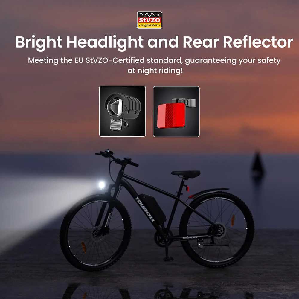 A 29 colos kerékméret miatt a Touroll U2 főként 175 cm feletti bringásoknak ideális, de 165–200 cm közötti magasságig kényelmesen használható. A 720 mm széles kormány kellően stabil irányítást biztosít. Ne aggódj a víz miatt sem: az IPX5 vízállóság megengedi, hogy ne csak napsütésben gondolj bringázásra. Sötétedés után is nyugodtan folytathatod az utat, a EU StVZO szabvány szerinti első LED lámpa és a hátsó fényvisszaverő ugyanis megfelelő láthatóságot biztosít minden helyzetben.