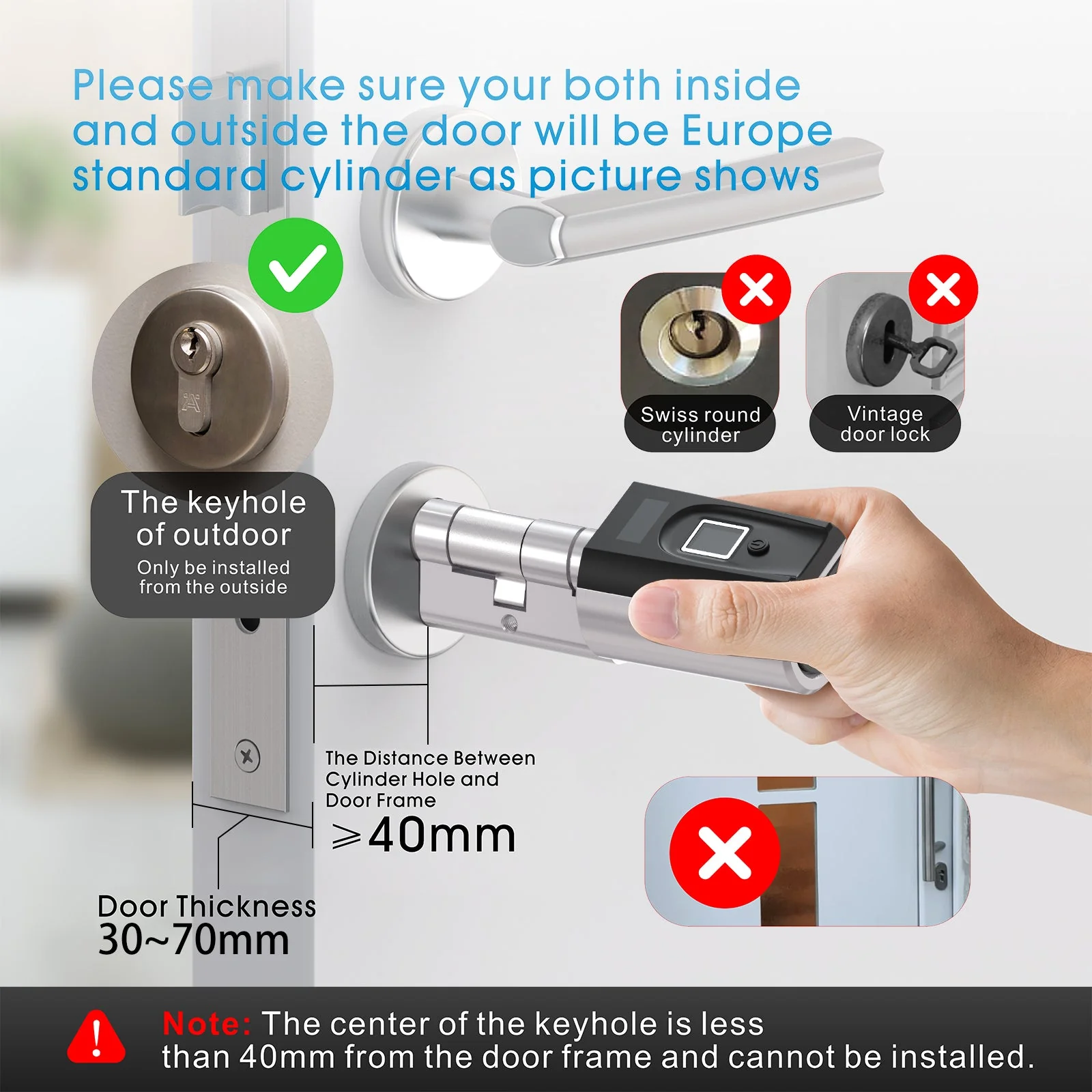 Az európai sztenderdeknek megfelel, így minden szabvány méretű ajtóba beszerelhető, de a hossza állítható, így 50-100 mm vastagságú nyílászárókba is beépíthető.