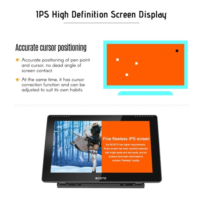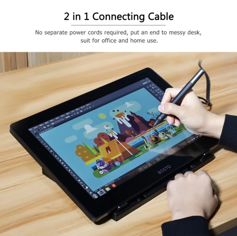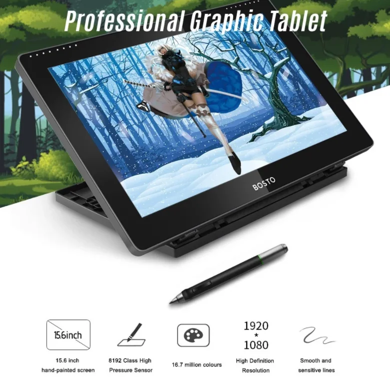 A BOSTO BT-16HD egy digitális rajztábla, ami 15,6 colos, FHD felbontású, IPS, nyomásérzékeny érintőpanellelt kapott. A készülék plug&play, vagyis a számítógéphez való csatlakoztatás után rögtön használható. Mellékelnek hozzá egy érintőtollat, ami passzív technológiával rendelkezik, vagyis akku nélkül működik, ráadásul 20 darab pótfej is jár hozzá. A kijelző állványa több szögben állítható, ami garantálja a kényelmes használatot. A szettben egy rakás kiegészítőt találtok, ilyen például a tollnak a tartója, tisztítókendő, kesztyű, töltőkábel, mindenre gondolt a gyártó. 63 000 forintért tudjátok megvásárolni Németországból.