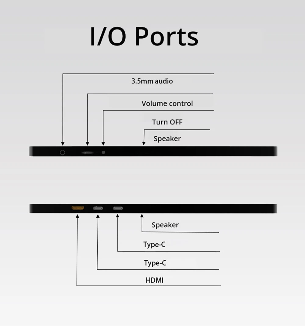 A méreteit tekintve a monitor 358x230x9 mm-es és 524 grammot nyom a mérlegen. A kijelző körülötti kávákat sikerült jó vékonyra tervezni, alul 9, míg oldalt mindössze 5 mm-esek. Mindezek ellenére került bele két hangszóró, a rövidebb élein pedig találtok 3,5 mm-es jacket, hangerőszabályzó és bekapcsoló gombokat, egy mini HDMI és két Type-C portot. Utóbbiak egyszerre szolgálnak kép és energiaátvitelre is, tehát a megfelelő eszközökkel akár egy kábellel is használható.