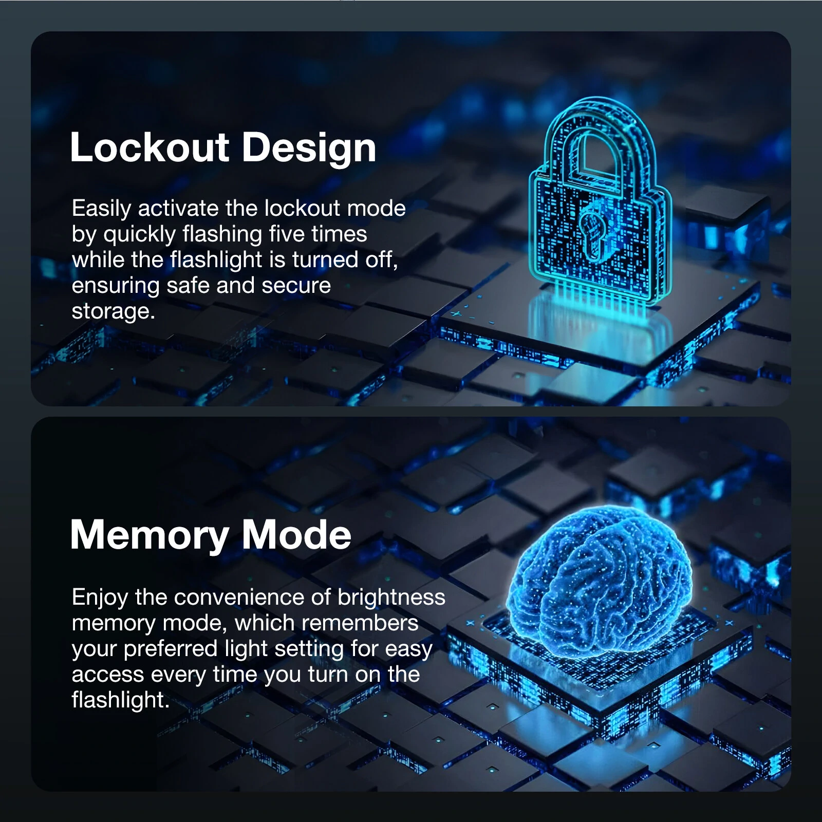Memória móddal is rendelkezik, amely megjegyzi az utolsó beállított fényerősséget, így nem kell újra és újra manuálisan állítgatnod. Az öt klikkes lockout funkció pedig megakadályozza a véletlen bekapcsolást, így nyugodtan bedobhatod a hátizsákodba vagy zsebedbe anélkül, hogy lemerülne.