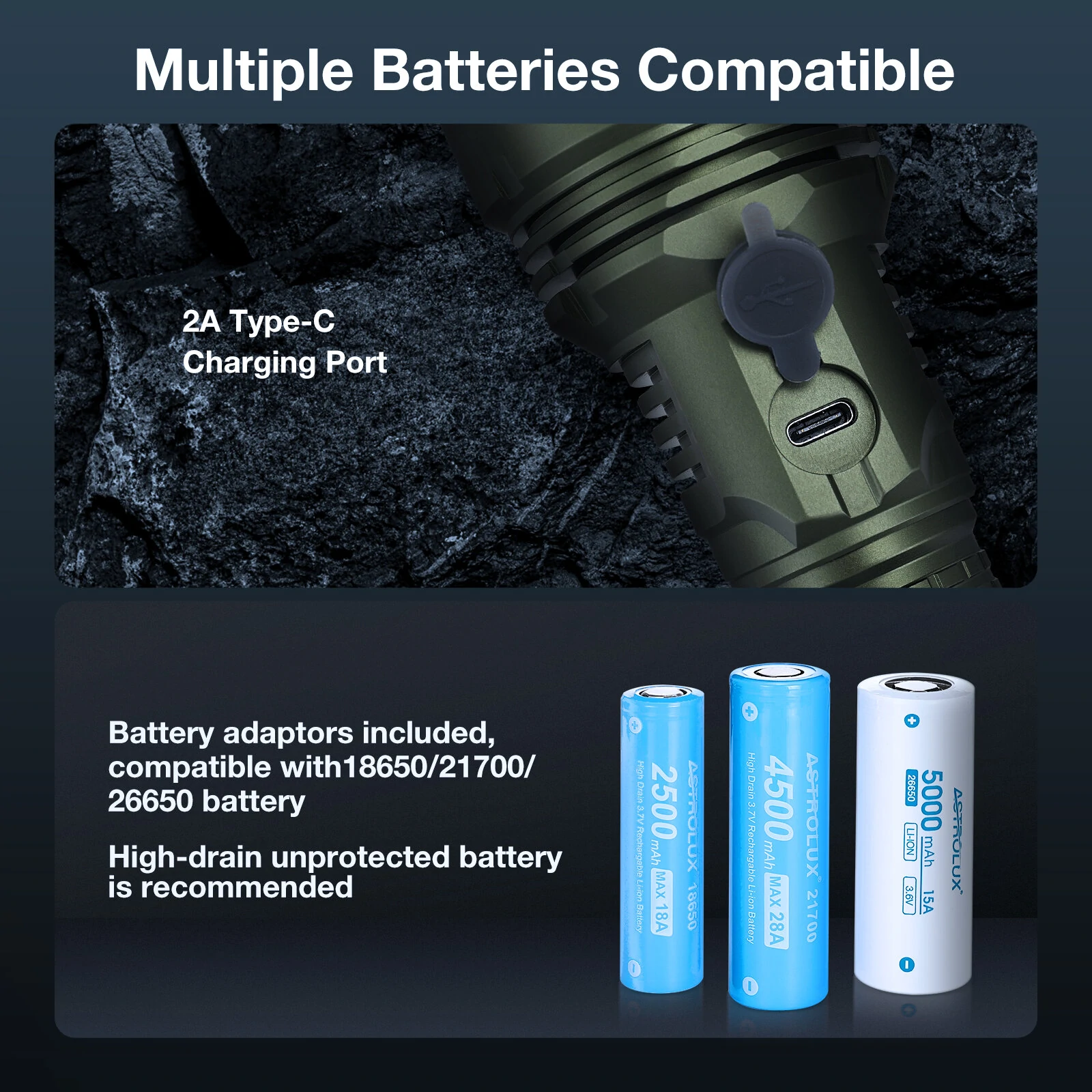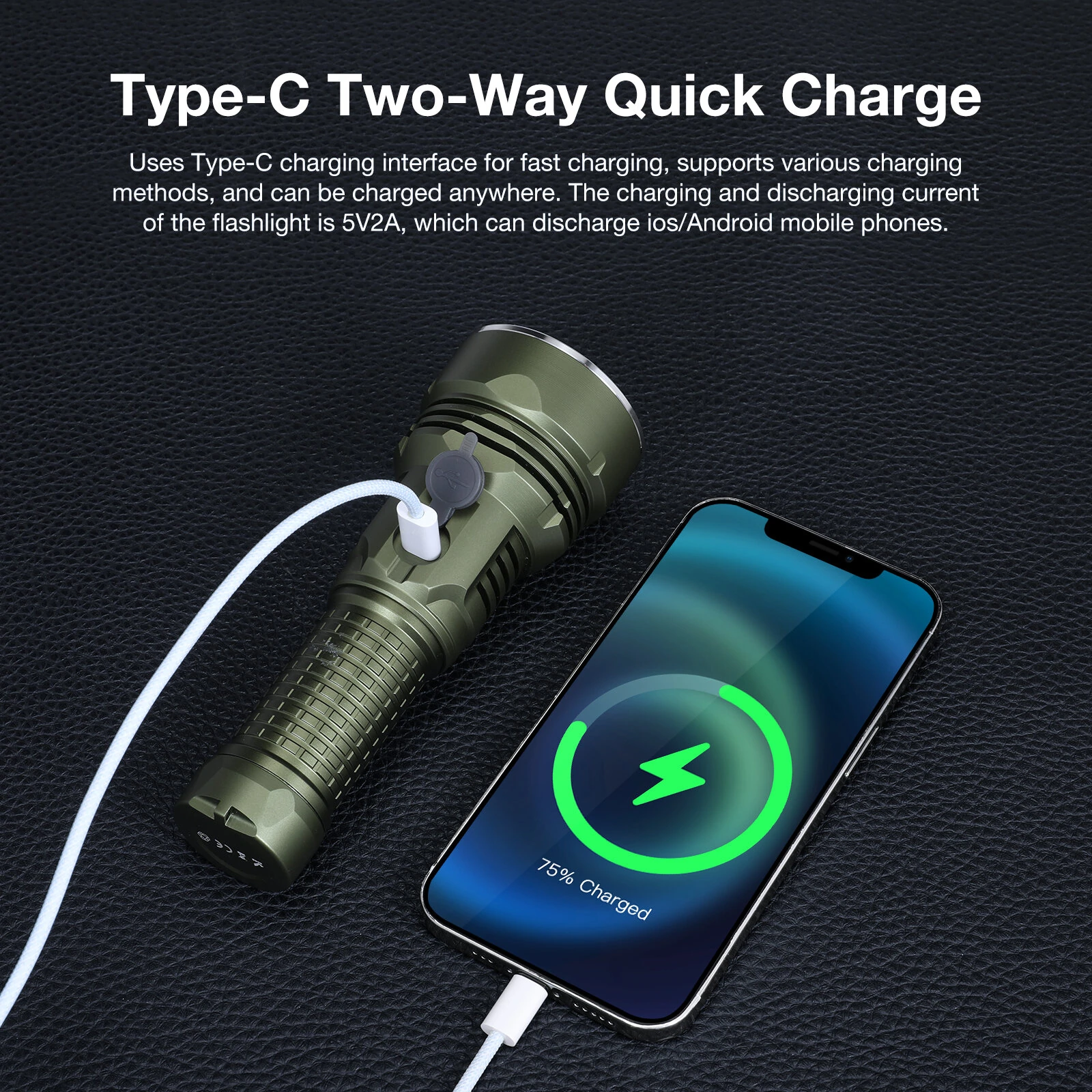 Nemcsak fényerejével győz meg, a zseblámpa Type-C kétirányú gyorstöltéssel rendelkezik, ami azt jelenti, hogy gyorsan újratöltheted, de akár power bankként is használhatod, ha épp a telefonod lemerülne. A különböző akkumulátorokkal való kompatibilitás (18650, 21700, 26650) tovább növeli a rugalmasságot. Ha akár több napig is úton vagy, akkor sem kell aggódnod, hogy nem találsz megfelelő áramforrást, hiszen az FT02S V2 szinte bármilyen típusú akkumulátort képes kezelni.