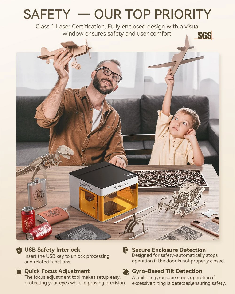 A gravírozó teljesen zárt kialakítású, és megfelel az 1. osztályú lézerbiztonsági előírásoknak.