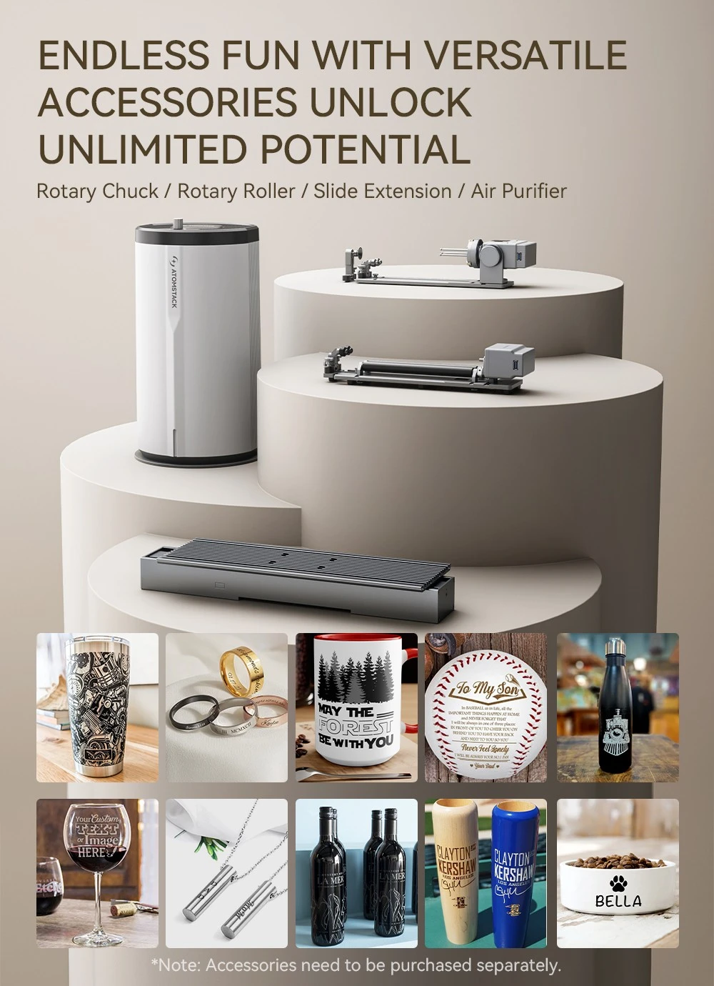 Ha még ennél is többet szeretnél, akkor a P1 kiegészítő támogatása is tetszeni fog. Külön vásárolható forgófejekkel, hengerekkel és hosszabbító tengelyekkel bővítheted a funkcionalitását, így akár termoszokat, gyűrűket és karkötőket is megmunkálhatsz, voltaképpen bármit.