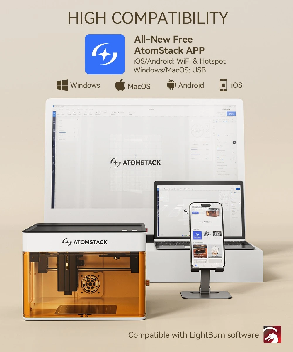 A géphez egy saját AtomStack szoftver jár, amely tele van előre beállított anyagparaméterekkel, így még kezdőként is gyorsan és egyszerűen nekiállhatsz a munkának. Az automatikus kiegészítő felismerés leegyszerűsíti az eszköz használatát, és kompatibilis a legnépszerűbb platformokkal, így Androidon, iOS-en, Windows-on és macOS-en is működik. Ha még nagyobb testreszabhatóságra van szükséged, akkor a LightBurn szoftverrel is használhatod (külön vásárolható).