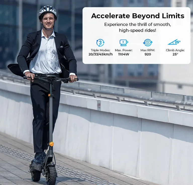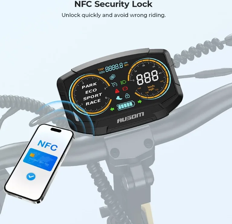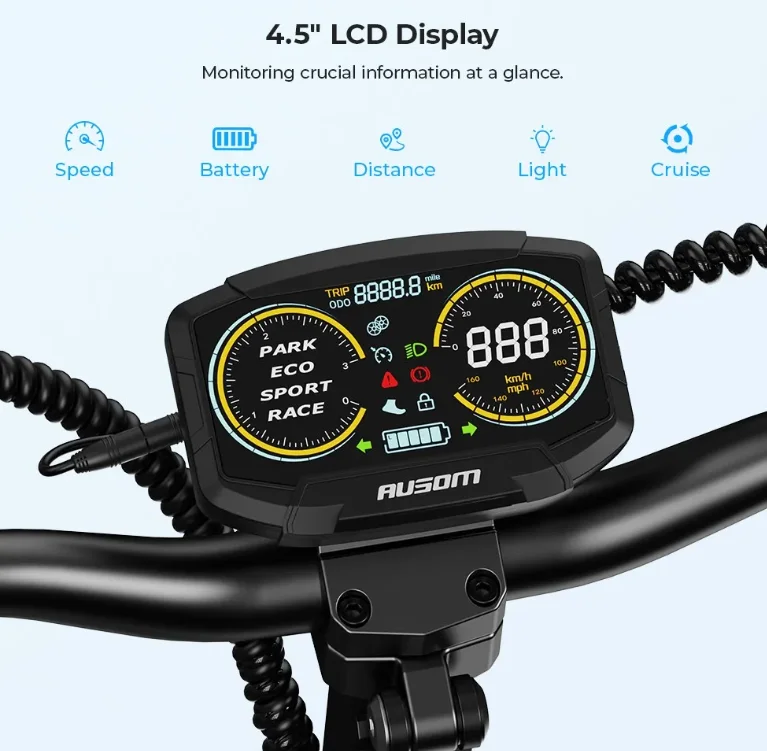 A biztonságért dupla tárcsafék felel: ha hirtelen kell megállni egy váratlan taxiajtó nyílásakor, az L2 nem fog zavarba jönni. A kormányon lévő LCD kijelző szinte minden infót megmutat: távolság, akkumulátor töltöttség, sebesség, világítás, irányjelzők, sebességi mód (Eco/Sport/Race). Az egymotoros verzió 20/33/45 km/h sebességeket tud, míg a duál motoros 21/35/55 km/h tempókat hoz. És persze van NFC-zár is: elég egy koppintás a kártyával, és indulhatsz is. Az Ausom L2 rollernél a világításon sem spóroltak: erős első LED fényszóró, jól látható hátsó lámpa és irányjelzők gondoskodnak arról, hogy sötétedés után is biztonságban közlekedj.