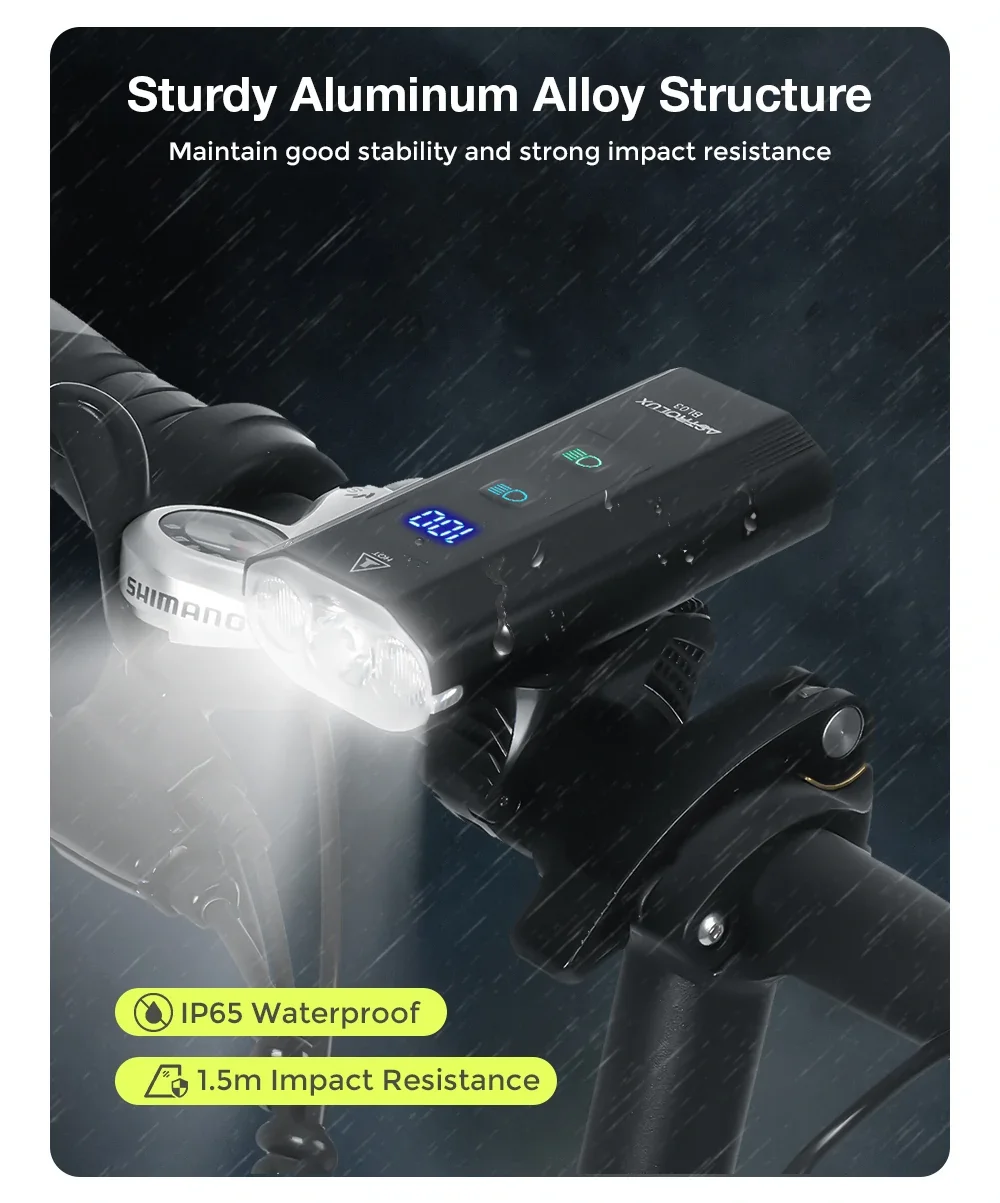 Mivel ez egy bringalámpa, értelemszerűen teljesít víz- és porállósági szabványt is, jelen esetben az IP65-öt, illetve 1,5 méter magasról le is ejthetitek, azt is bírja. A tartója sínes megoldású, a vakupapucshoz hasonlatos, és egy tekerővel lehet meghúzni, nem a gagyi szilikonos vagy a „gyorsszorítós” műanyag rendszerű. Van rajta gyorsoldó gomb is, így lekaphatjátok, ha féltek attól, hogy mások is szemet vetnek rá. Ahogyan már említettem, kiegészíthető egy nyomógombbal is, amit a Type-C portba kell dugni.