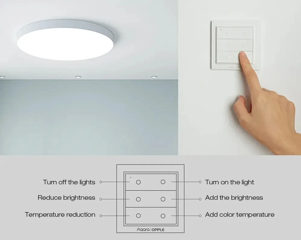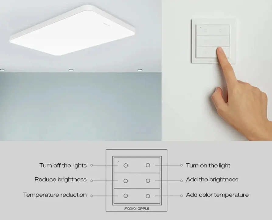 Ha rendelkezünk Aqara Gateway-jel, akkor tudjuk vezérelni Mi Home-mal, Apple HomeKittel, és Aqara Home-mal. Ha nem kell az okostelefonos vezérlés, akkor hagyományos módon is használható, mivel adnak hozzá egy hatgombos Aqara fali kapcsolót, ami vezeték nélkül működik, és tudjuk vele állítani a fényerőt és a színhőmérsékletet is.