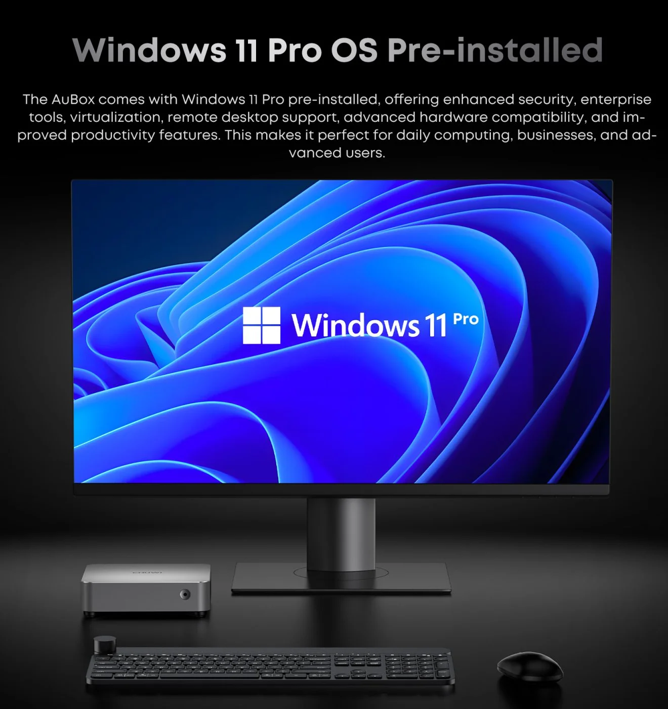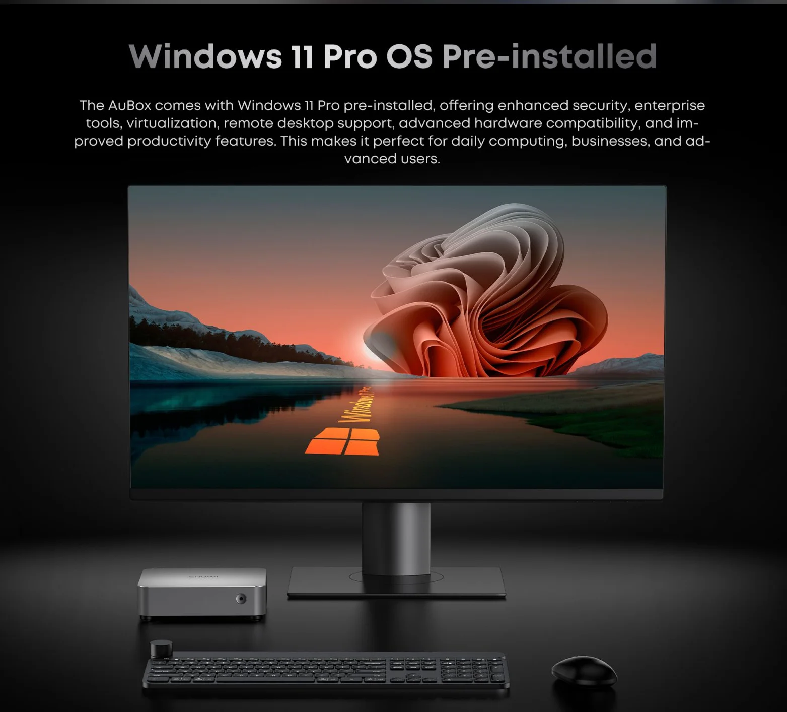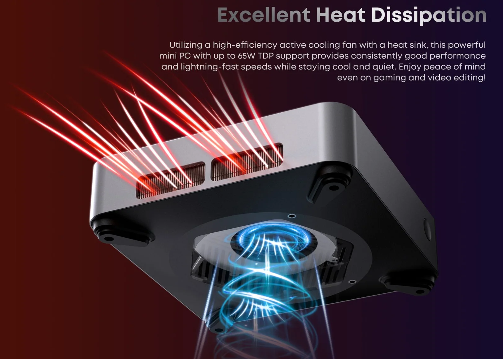 Csatlakozóból bőven kapsz: két USB-C (köztük Thunderbolt 4 / USB4), négy USB-A (ebből kettő USB 3.2 Gen 2), DisplayPort 1.4, HDMI 2.1, két 2.5G LAN, valamint Wi-Fi 6 és Bluetooth 5.1 / 5.2. Ennek köszönhetően akár négy darab 4K kijelzőt is ráakaszthatsz egyszerre, a netkapcsolat pedig villámgyors és stabil marad. A teljesítményhez kell hűtés is, de a CHUWI erre is gondolt: a 65 W TDP-t gond nélkül kezeli az aktív hűtés, a ventilátor és a hőcső páros pedig csendben és hatékonyan tartja kordában a meleget. És hogy a szoftver se hiányozzon, a gép gyárilag Windows 11 Pro-val érkezik, így minden adott az üzleti felhasználáshoz, a távoli eléréshez és a mindennapi biztonságos munkához.