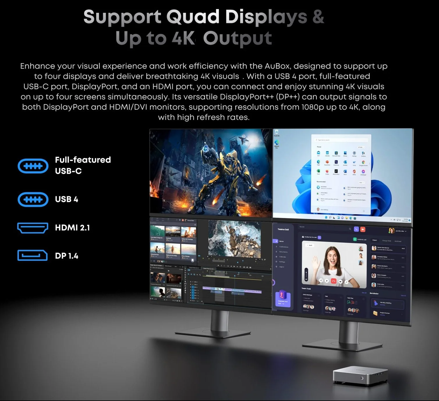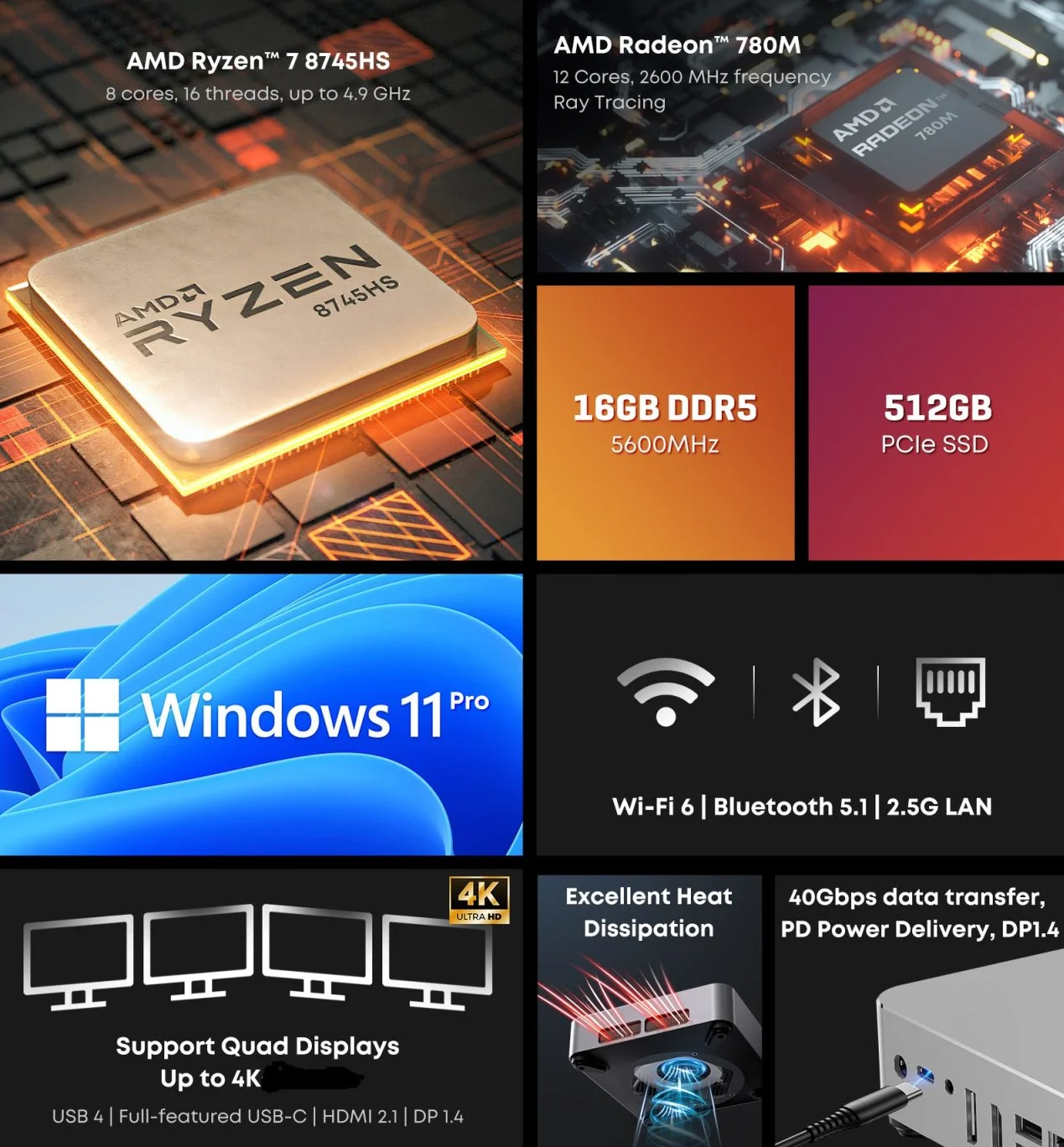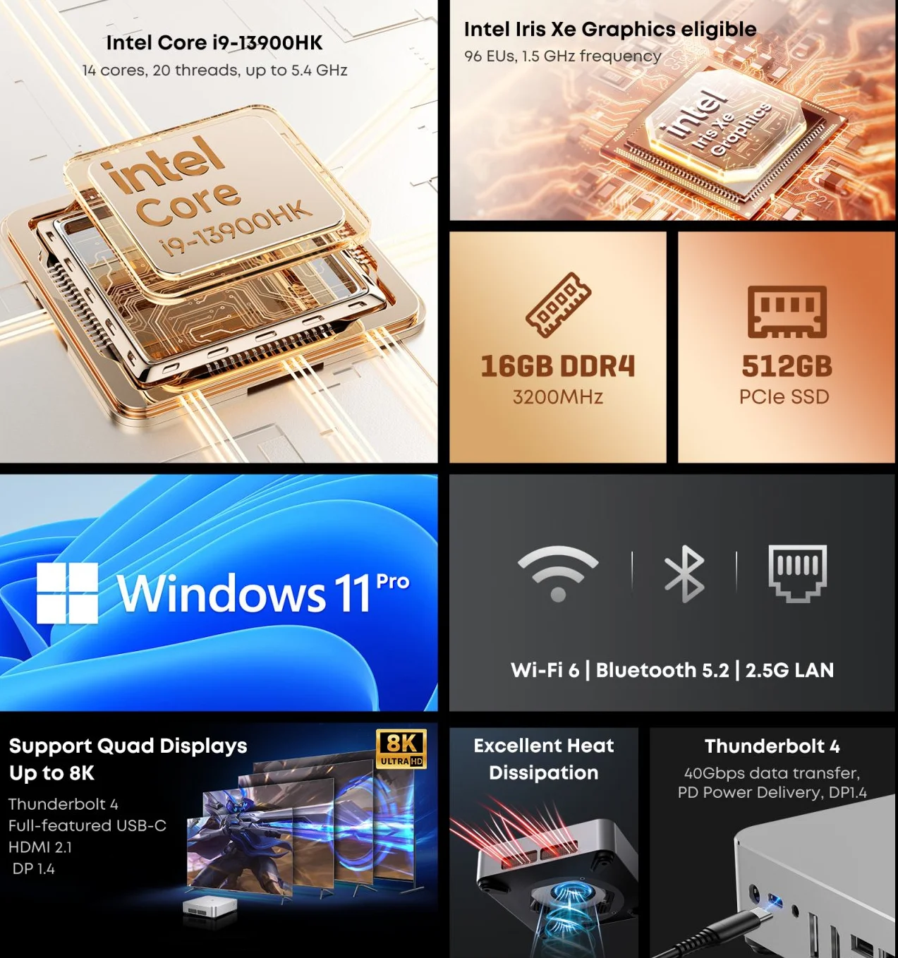 Csatlakozóból bőven kapsz: két USB-C (köztük Thunderbolt 4 / USB4), négy USB-A (ebből kettő USB 3.2 Gen 2), DisplayPort 1.4, HDMI 2.1, két 2.5G LAN, valamint Wi-Fi 6 és Bluetooth 5.1 / 5.2. Ennek köszönhetően akár négy darab 4K kijelzőt is ráakaszthatsz egyszerre, a netkapcsolat pedig villámgyors és stabil marad. A teljesítményhez kell hűtés is, de a CHUWI erre is gondolt: a 65 W TDP-t gond nélkül kezeli az aktív hűtés, a ventilátor és a hőcső páros pedig csendben és hatékonyan tartja kordában a meleget. És hogy a szoftver se hiányozzon, a gép gyárilag Windows 11 Pro-val érkezik, így minden adott az üzleti felhasználáshoz, a távoli eléréshez és a mindennapi biztonságos munkához.
