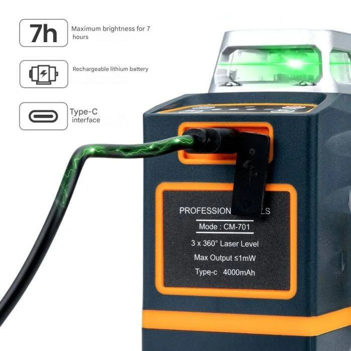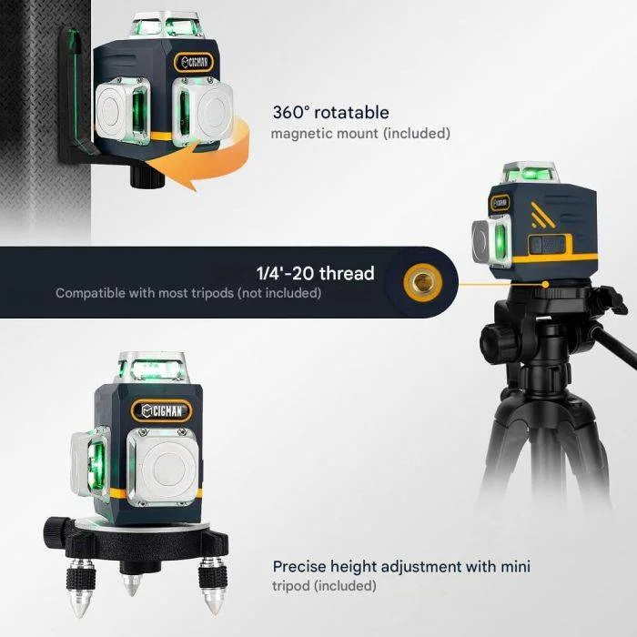 A rögzítés is pofonegyszerű: a 360°-ban forgatható, erős mágneses L-talp fémre cuppan, és ott tartja, ahol kell, a 1/4 hüvelykes állványmenet pedig bármelyik fotó- vagy műszerállvánnyal kompatibilis. A dobozban minden benne van, ami a rajthoz kell: CM-701 lézerszintező, hordtáska, mágneses „L” talp, mini tripod talp, távirányító, lézercél tábla, Type-C kábel és használati útmutató. A gyakorlatban ez azt jelenti, hogy rögtön nekiugorhatsz burkolásnak, padlószintezésnek, mennyezeti síneknek, szegőléc-/gipszkartonozásnak, vagy akár komolyabb terepen fal-, híd-, vasút- és mérnöki kivitelezéseknek is – a CM-701 bőven fölé lő a „hobbi” kategóriának.