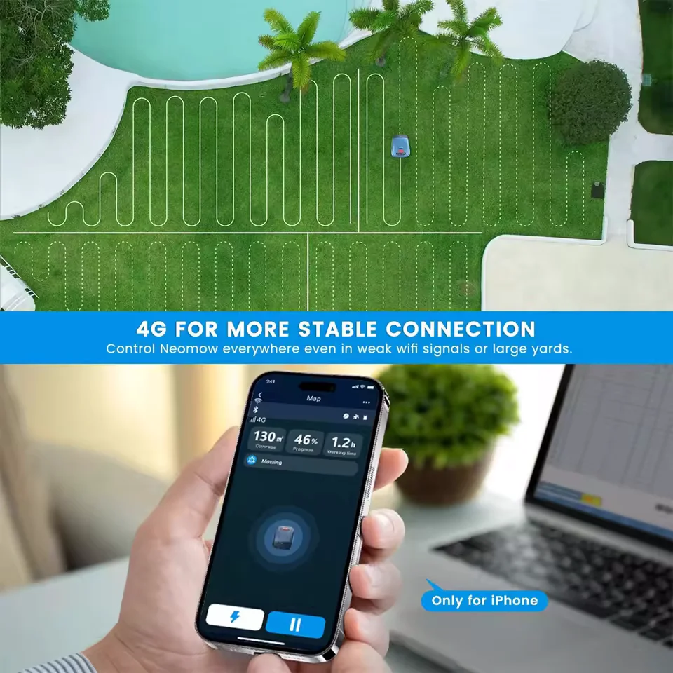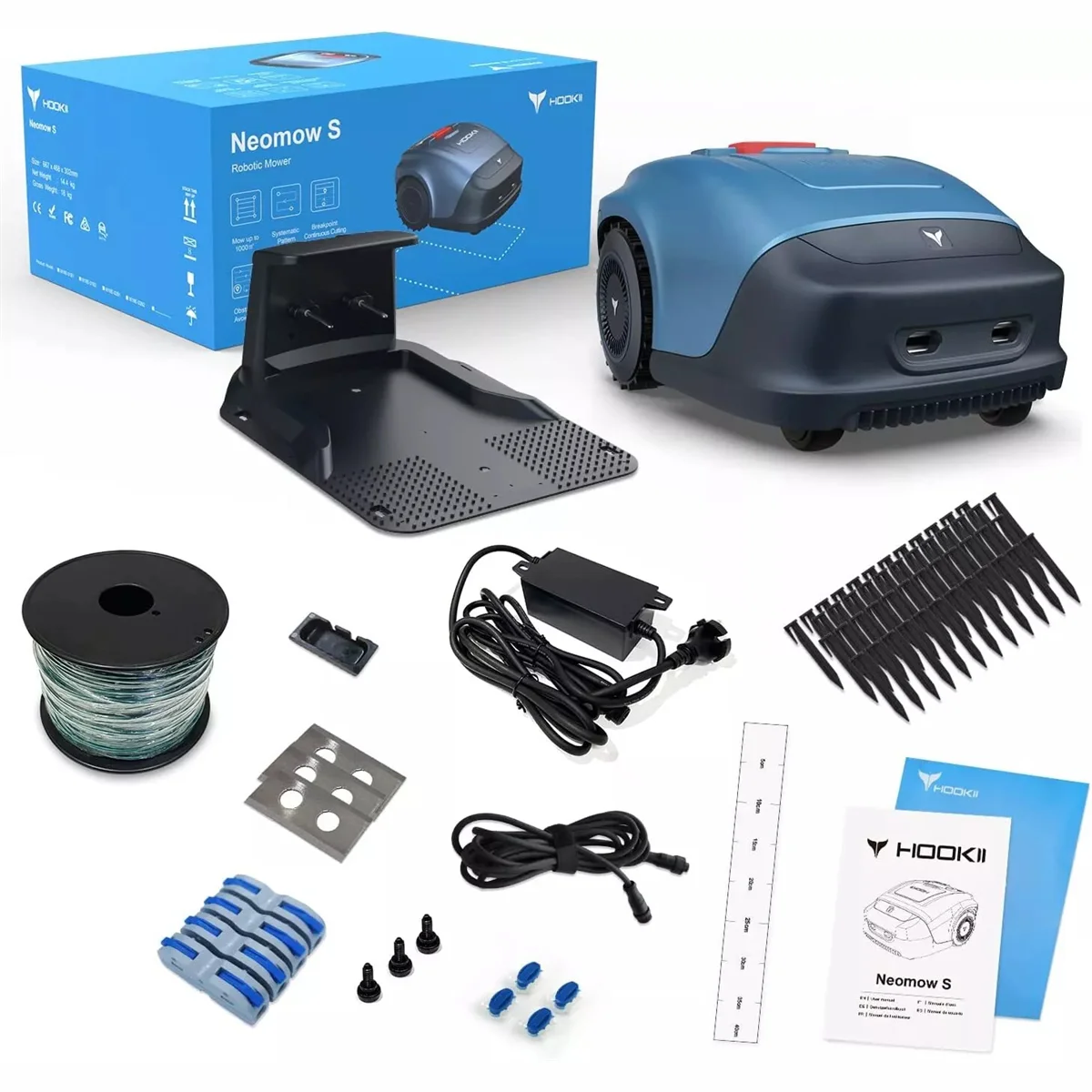A vezérlés a HOOKII mobilappon keresztül történik, ahol beállíthatod az időzítést, a nyírás módját (például keresztnyírás, napi karbantartás vagy személyre szabott program), és akár valós időben is követheted a robot állapotát. A készülékből létezik WiFi-s és 4G-s verzió is: kisebb, stabil WiFi-vel lefedett kertekhez elég az alap, de nagyobb vagy gyengébb hálózatú területekre inkább a 4G ajánlott a folyamatos, megbízható működéshez. A csomagban mindent megtalálsz, ami a telepítéshez és használathoz kell: a robotfűnyíró mellett jár hozzá töltőállomás, 150 méter határolókábel, 210 darab leszúrótüske, 9 penge, kábelcsatlakozók, adapter, felhasználói kézikönyv és gyors telepítési útmutató. A teljes képhez néhány adat: a robot mérete 48×38×26 cm, a súlya 9,3 kg, a sebessége 0,43 m/s, a vágási magasság 20–55 mm, az akkumulátor üzemi hőmérséklete 0–50 °C között ideális, és természetesen Bluetooth és WLAN kapcsolattal is rendelkezik.