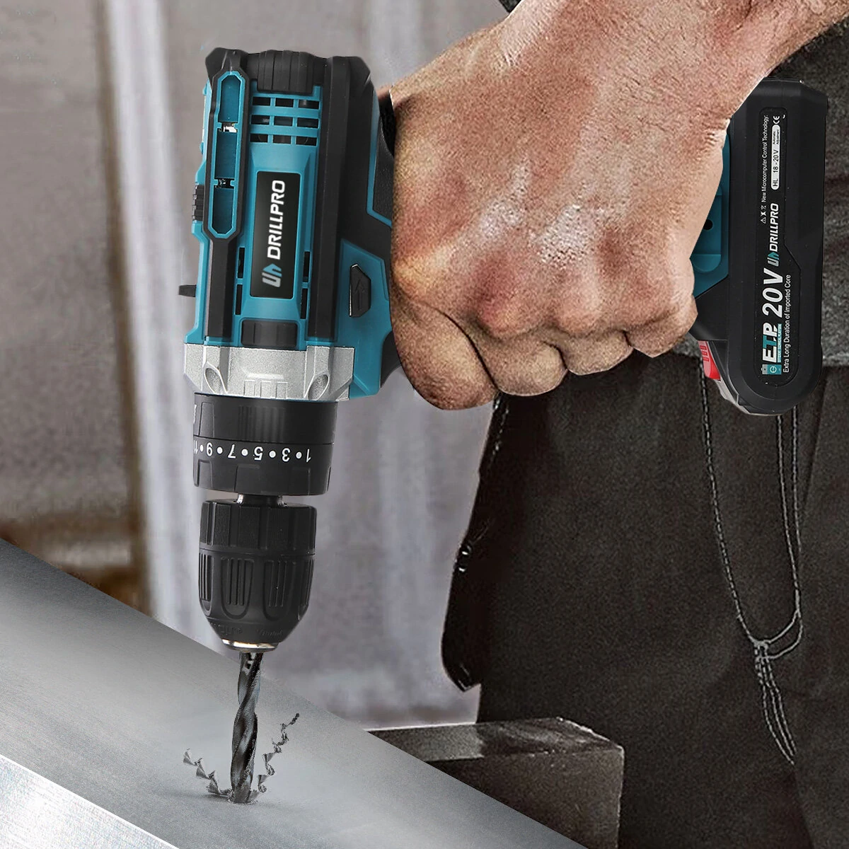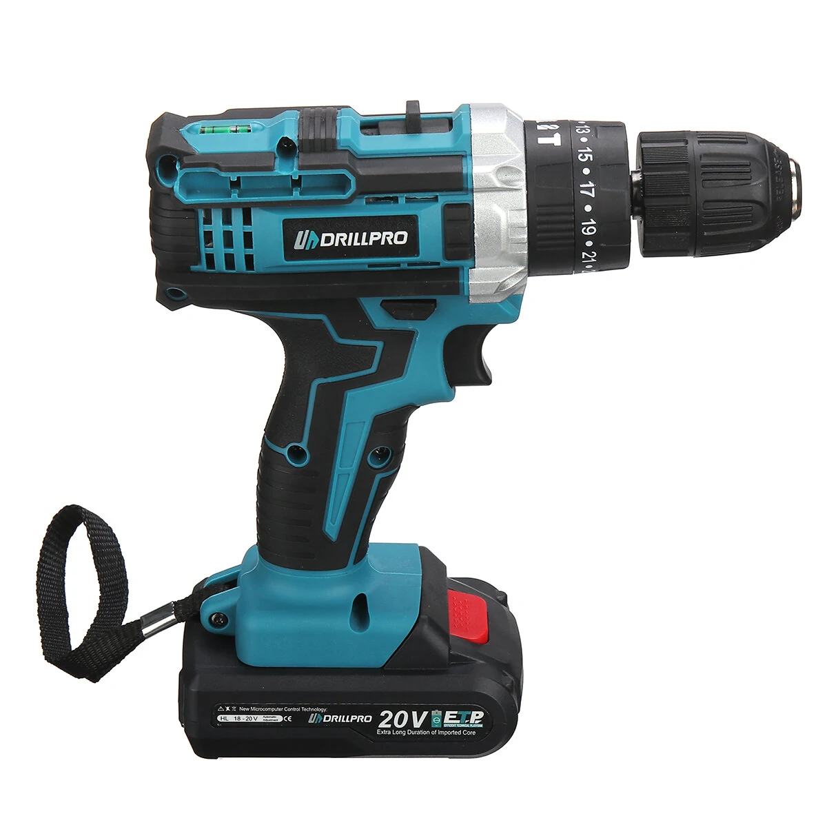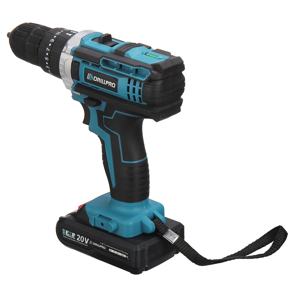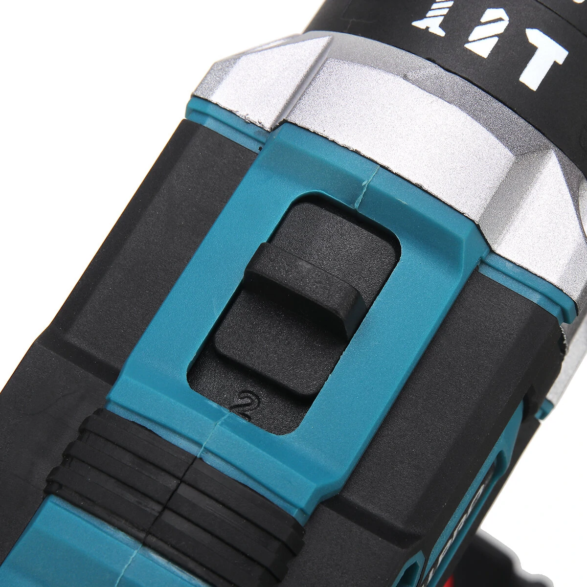 Tipikus fekete-türkizes kék szerszámdizájnnal rendelkezik a Drillpro ezen fúrógépe, amin a jól megszokott kezelőszervek láthatók. Az aljára kell felpattintani az aksit, van rajta egy ravasz, egy sebességváltó, forgásirány választó és egy nyomatékhatároló. A tokmánya gyors, kulcsnélküli kialakítású.