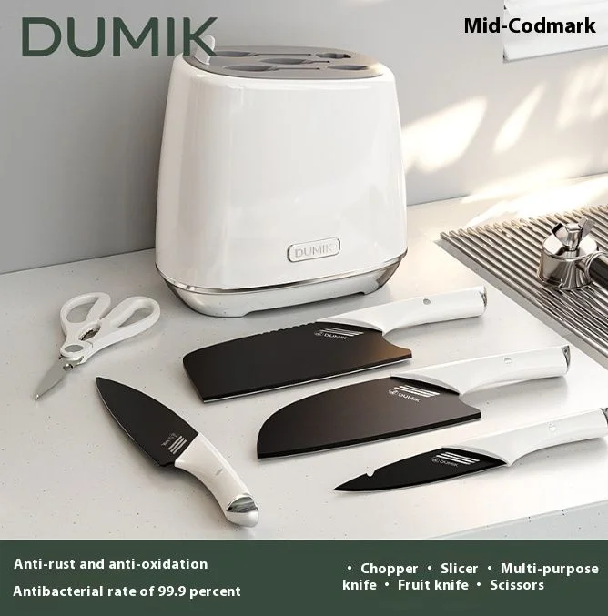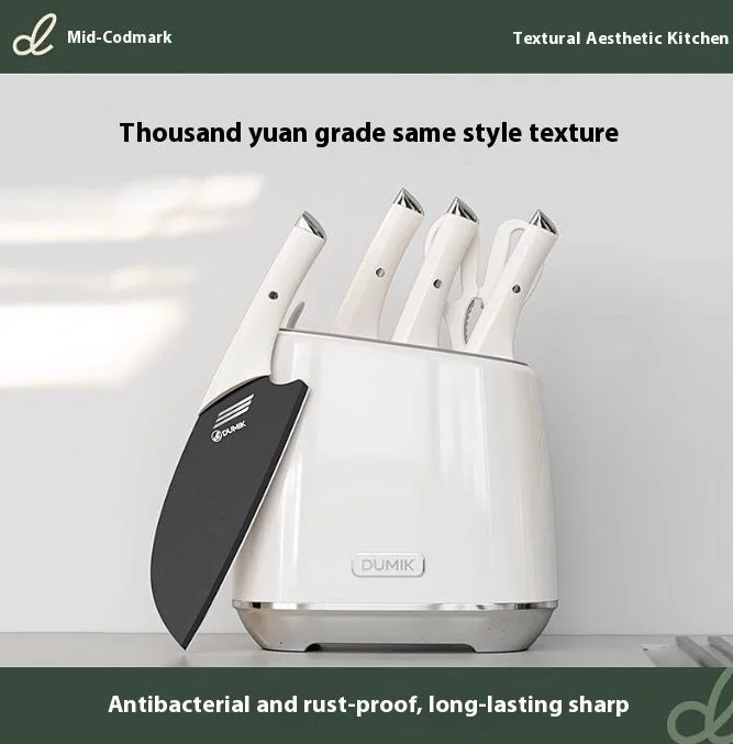 Már első ránézésre is egy nagyon patent, elegáns készletről van szó fekete pengékkel, fehér markolattal és tartóval. A polipropilén markolatú kések rozsdamentesek és ergonomikus, könnyed kialakításuknak hála hosszabb távon is kényelmesen lehet velük szeletelni. Az éles pengék ráadásul kaptak egy antibakteriális bevonatot is, ami a gyártó elmondása alapján majdnem 100%-osan távol tartja a letelepedni vágyó bacikat. Az elegáns tartó azonos bevonattal készült, ezáltal sokkal könnyebben takarítható, mint a fa társai és még a penész is el fogja kerülni.