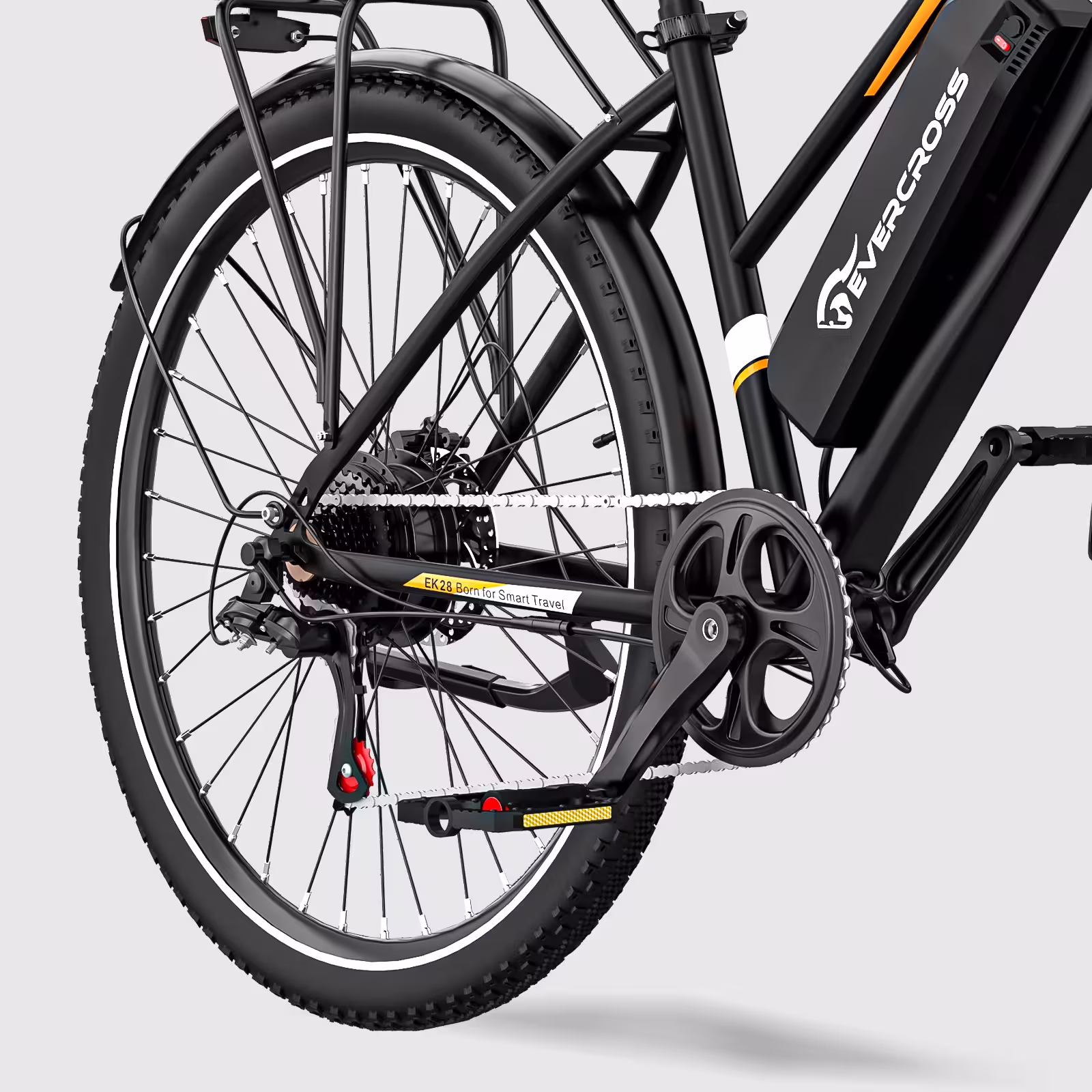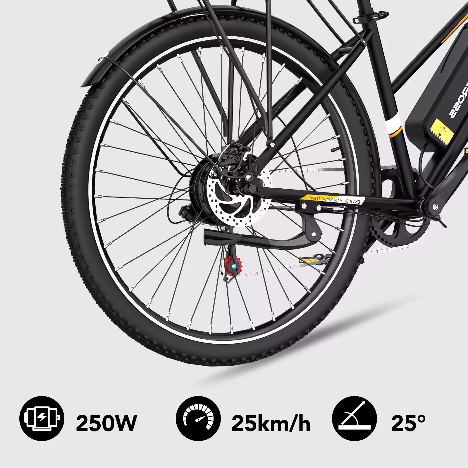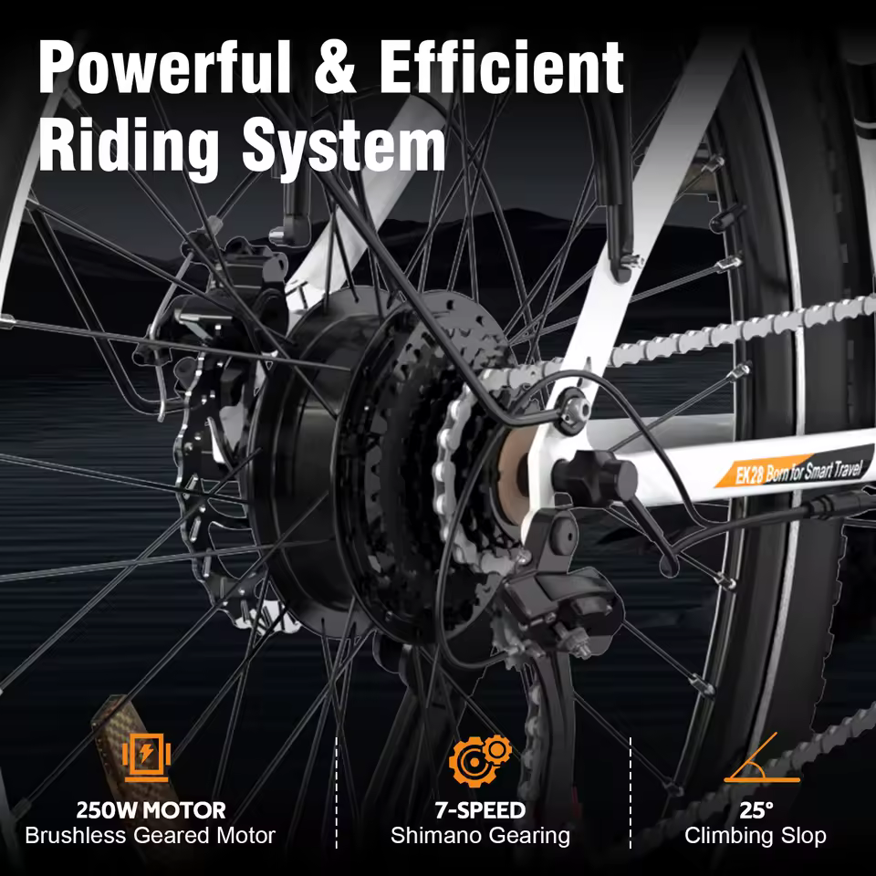Üzemmódból hármat kapunk: a teljesen elektromos mód 25 km/h-ig mindent intéz helyetted, a pedálrásegítéses üzem növeli a hatótávot, a manuális mód pedig egyszerű bicajként működteti az EK28-at. A váltás egyetlen gombbal történik, és a multifunkciós LCD kijelzőn minden fontos adat: sebesség, táv, üzemmód, akkumulátor egy pillanat alatt leolvasható. A felszereltség tisztességes: Shimano 7 sebességes váltó, első és hátsó tárcsafék, erős LED-es első lámpa, hátsó ülés/csomagtartó és IP54-es vízállóság, vagyis egy nyári zápor sem teszi tönkre a napodat.