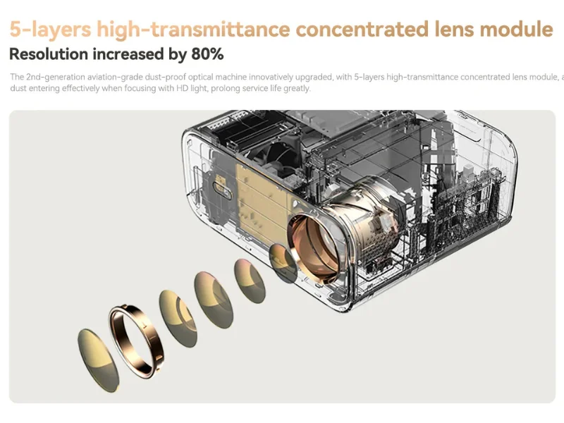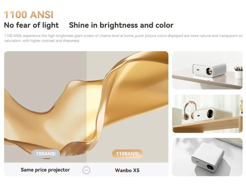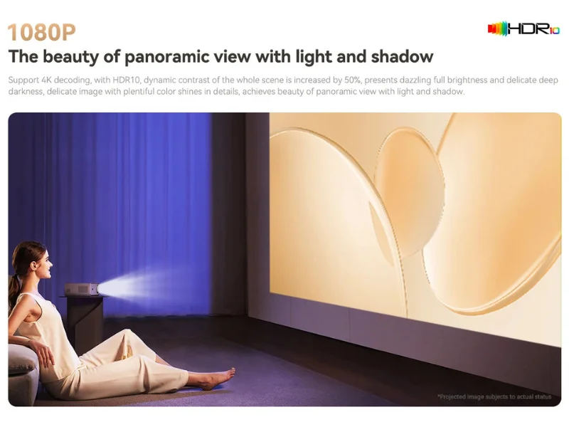 A Wanbo X5 projektor tökéletes választás mind beltéri, mind kültéri használatra, hiszen kristálytiszta, óriási képével valódi moziélményt nyújt. Egyik legnagyobb előnye a kivételesen magas, 1100 ANSI lumen fényereje, ami azt jelenti, hogy a kép tisztasága és élénksége még nappali fényben is lenyűgöző. A natív 1080P felbontás mellett a projektor képes 4K tartalmak dekódolására is. A HDR10 támogatásnak köszönhetően a dinamikus kontrasztarány megnő,