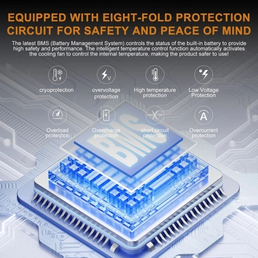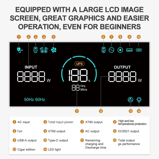 A szokott funkciók – LCD-kijelző a terhelés és a töltés nyomon követéséhez, LED-lámpa – mellett nagyon helyesen jó vastagon beburkolták a külsejét ütésálló anyaggal, így nem vall szégyent terepen sem. Feltölteni hagyományos 230-as hálózatról, autós töltőről – 12 V-os szivargyújtós – és napelemről is lehet. Öt fokozatban állítható a bemeneti teljesítmény: 300 W, 500 W, 700 W, 900 W és 1100 W, a használati környezetnek és a töltési igényednek megfelelően választhatsz. Biztonságosabban használhatod, és meghosszabbíthatod a hordozható tápegységed élettartamát, ha alacsony bemeneti teljesítményt választasz.