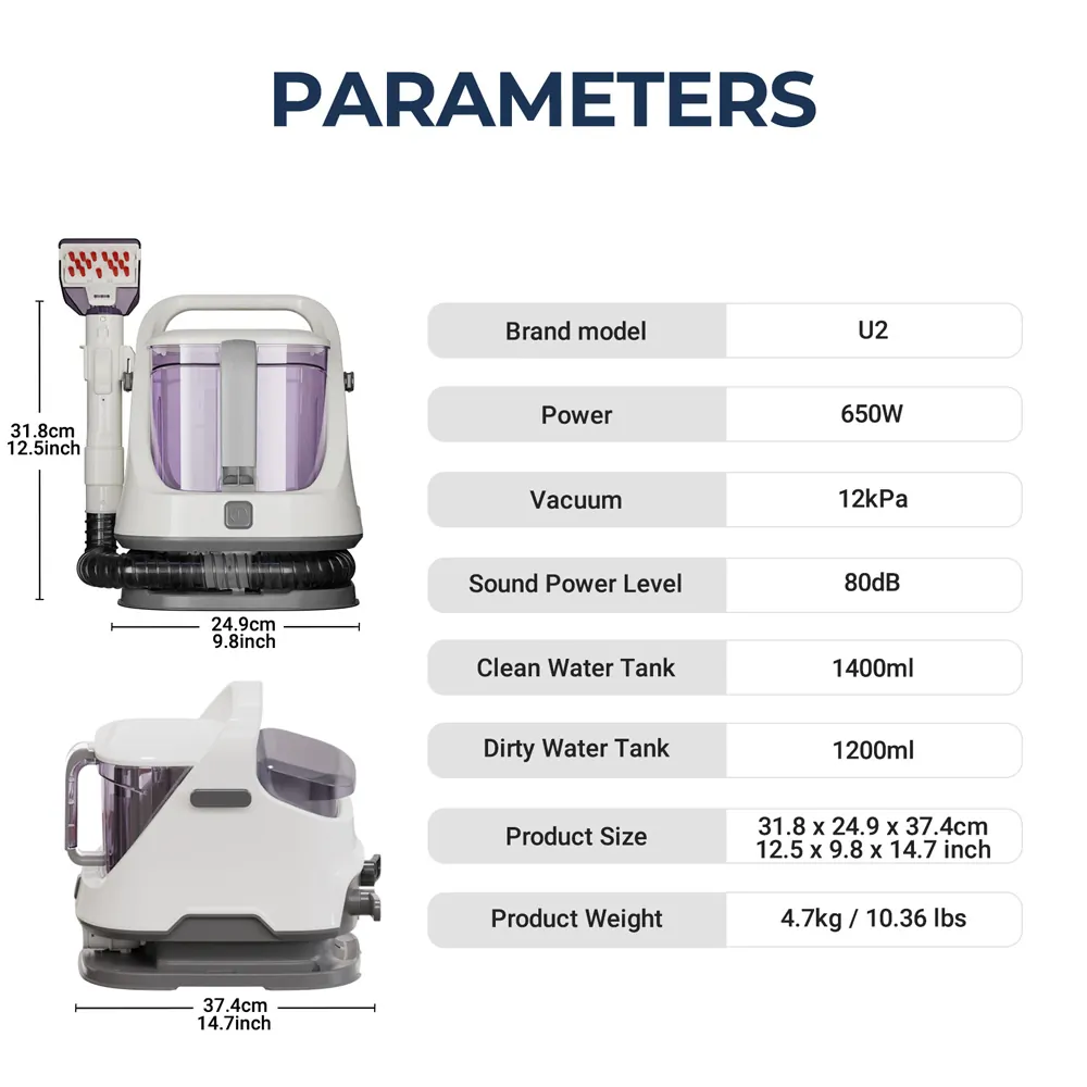 A 230 voltos hálózatról működő kárpittisztító 3 méteres kábellel érkezik, amely elegendő mozgásteret biztosít a legtöbb helyiségben. A 650 wattos teljesítményével akár 12 kPa szívóerőt generál, így még a mélyebb rétegekben megbújó szennyeződéseket is eltávolítja. Kompakt mérete (374×249×318 mm) és mindössze 4 kg-os súlya megkönnyíti a tárolását és mozgatását. Az 1,1 méter hosszú cső végén egy kefés fej található, amelyen egy gombbal adagolható a tisztítószer.