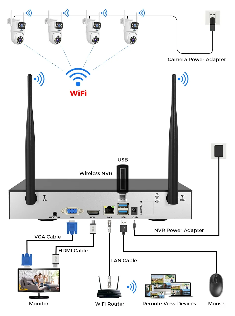 A csomag tartalma: 4 WiFi kamera, 1 db 10CH NVR, 4 EU tápegység a kamerákhoz, 1 tápegység az NVR-hez, USB egér, LAN és HDMI kábel, 4 vízálló csatlakozókészlet, rögzítőcsavarok, kézikönyv és masszív doboz.
