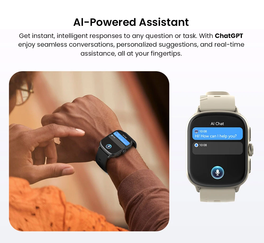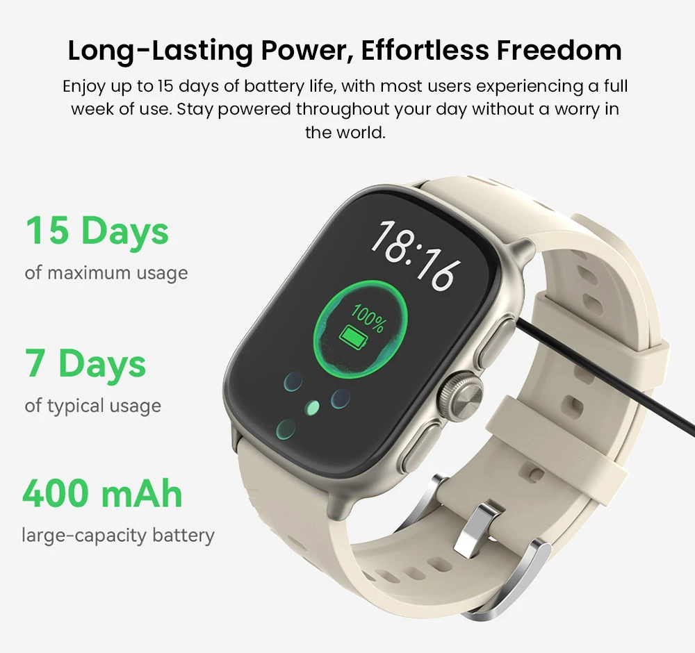Az akkumulátor sem hagy cserben: a 400 mAh-s lítium-ion telep akár 15 nap üzemidőt biztosít normál használat mellett, Always-On módban is hozza az 5 napot, és ha mégis lemerülne, a mágneses gyorstöltővel mindössze 2 óra alatt 100%-ra tölthető. Stílusban is sokoldalú: több száz óraszámlap közül választhatsz, köztük AI-generált dizájnokkal és dinamikus videós hátterekkel. A forgatható korona új információkat és animációkat tár eléd, a beépített ChatGPT-alapú asszisztens pedig azonnal segít, ha kérdésed vagy feladatod van.