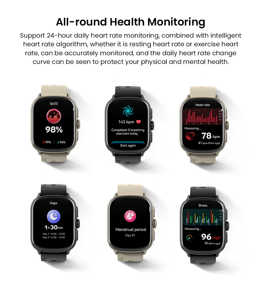 Ami a méreteket illeti: az óra 52,5×41,45×13,5 mm, súlya pedig mindössze 60 g, így kényelmesen hordható egész nap. A csomagban megtalálod az órát a cserélhető szilikonszíjjal, a mágneses gyorstöltőt, valamint a felhasználói kézikönyvet. A kapcsolatot a legújabb Bluetooth 5.3 technológia biztosítja, és kompatibilis Android 5.0 vagy újabb, valamint iOS 9.0 vagy újabb rendszerekkel.