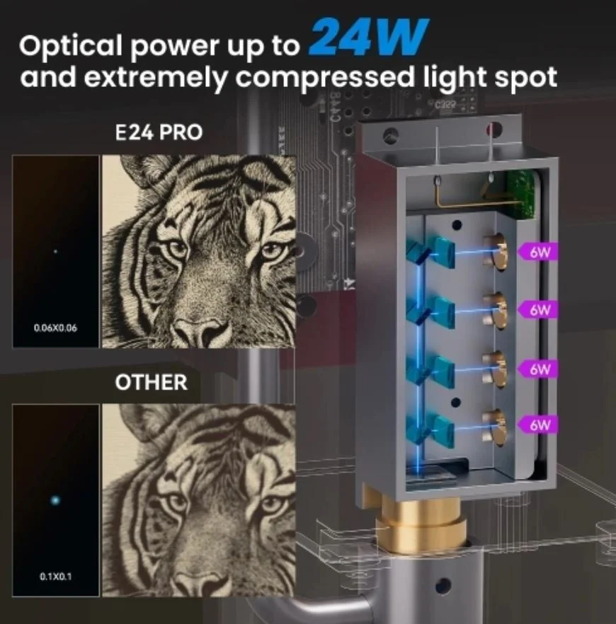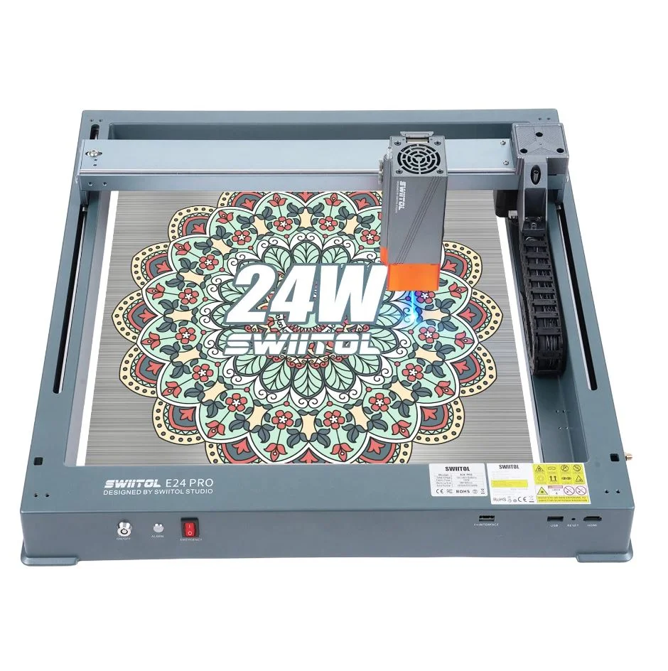 A Swiitol E24 Pro gravírozója 24 watt összteljesítményű lézert használ, a vágási pontossága 0,02 mm. A fókusz 0,06×0,06 mm, könnyen vághattok vele 15 mm-es akrillemezt, rozsdamentes acélt, kerámiát és üveget. Akár 36 000 mm/perc sebességű gravírozásra is képes, a maximális munkaterülete pedig 365×305 milliméter, amivel már egész jól lehet dolgozni.