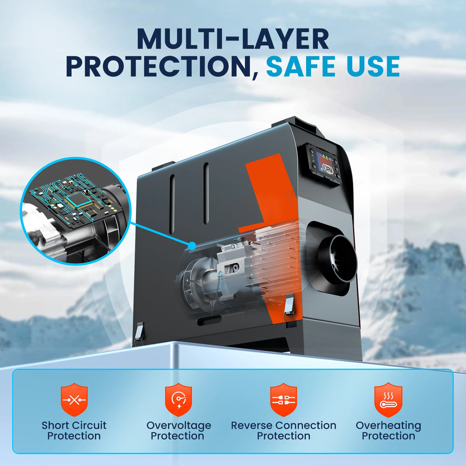A biztonsági funkciók, mint a túlmelegedés elleni védelem, ennél a típusnál is gondoskodnak a biztonságos használatról. A készülék 12V és 24V-os rendszerekkel is kompatibilis, így személyautókban és nagyobb járművekben is használható, ráadásul alacsony zajszintű működés mellett, így garantáltan nem fogja zavarni a köreidet. A beállítások között pedig megtalálható a hőmérséklet-szabályozás mellett, az időzítés és a gyors felfűtés is.