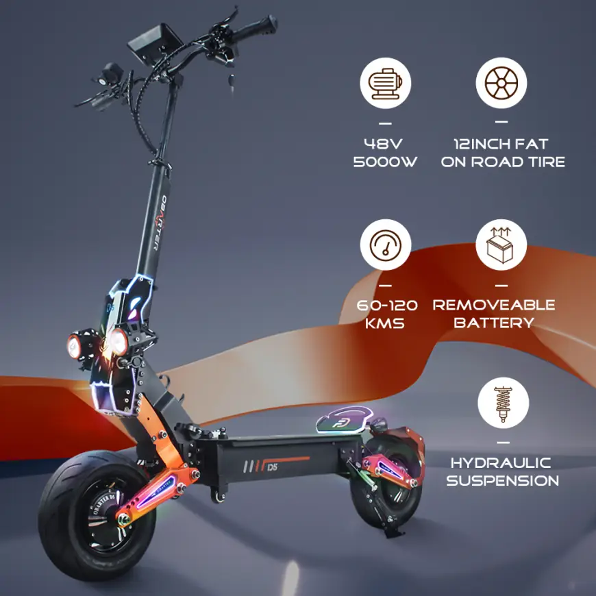 Az Obarter rollerek nem éppen arról híresek, hogy visszafogottak lennének, sem kinézetben, sem teljesítményben. Most is egy hatalmas példányról van szó, ami inkább már elektromos motor, sem mint roller, ami a 46 kilogrammos tömegéből is kiderül. 2×2500 W mozgatja, hiszen ez egy kétmotoros járgány, amelyik akár 70 kilométer/órára is képes felgyorsulni, miközben a 35 Ah-s, eltávolítható akkukból 60-120 kilométeres hatótáv is kijöhet, attól függően mennyire húzzátok neki. Feltölteni 5 A-es „gyorstöltéssel” tudjátok, de azért ennél a kapacitásnál ez így sem lesz egy gyors folyamat. Szerencsére nem kell a szörnyet becipelni a lakásba, elég, ha a telepet kikapjátok. Az akku tud más funkciókat is, például egy pici kijelzőn mutatja a töltöttségét, akkor is ha éppen nincs a D5-ben.