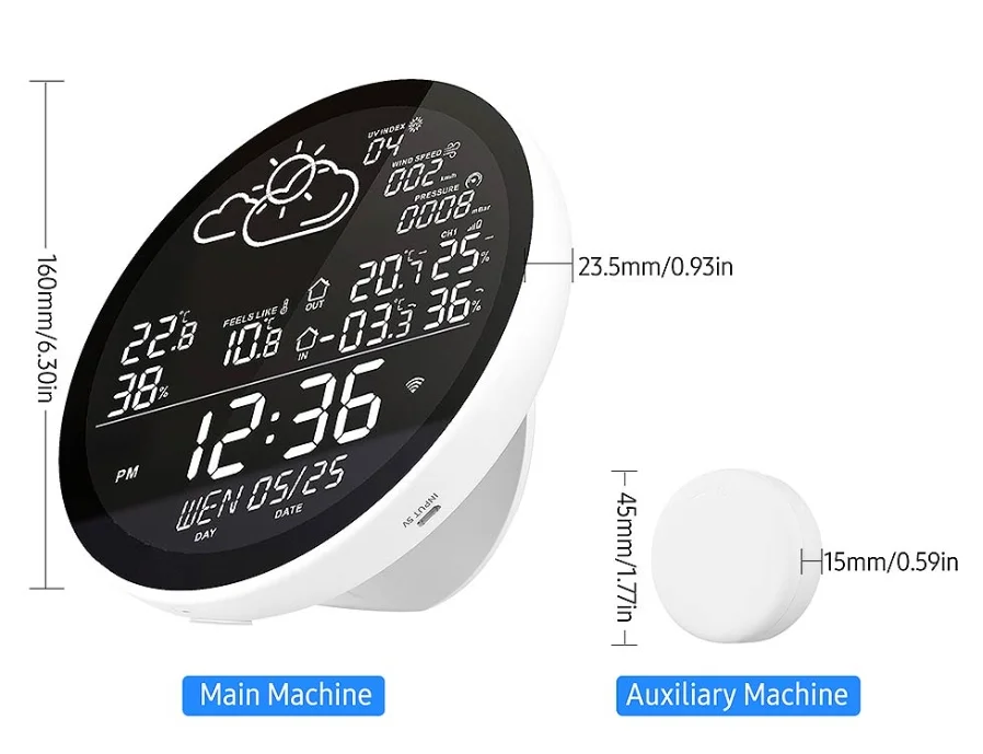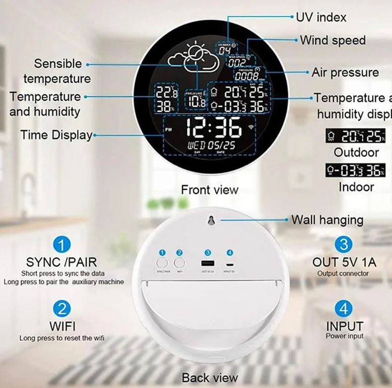 Mutatja a pontos időt és a dátumot, aztán pedig a lakás hőmérsékletét és a hőérzetet. A kütyühöz tartozik külső egység is, aminek a segítségével a kinti hőmérsékletet is láthatjuk. A csomagban egy vagy három szenzor van, attól függően, hogy melyik kiszerelést választjuk. Mivel a házon kívüli időjárás nemcsak a hőmérsékletből áll, így írja az UV indexet, a szél sebességét és a légnyomást is, valamint kis piktogrammal mutatja, hogy milyen lesz a várható időjárás. A kütyü falra szerelve kifejezetten jól néz ki, de egy kitámasztó lábbal is rendelkezik. A beltéri egységet micro USB-n keresztül kell megtáplálni, viszont nagyon jópofa dolog, hogy egy 5 wattos USB-A kimenet is van a hátoldalán, így például tölthetjük róla a telefonunkat.