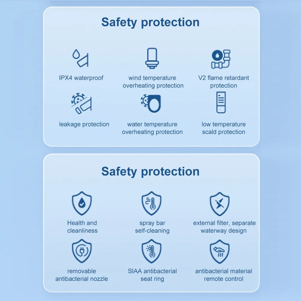 Biztonság mindenek előtt – az ülőke IPX4 vízálló, és rendelkezik szivárgásvédelemmel, túlmelegedés elleni védelemmel (vízre és levegőre egyaránt), lángálló V2 burkolattal, valamint alacsony hőmérsékletű égési sérülés elleni védelemmel is. Akár egy kisebb gyerek, akár egy idősebb családtag használja, a rendszer automatikusan óvja a bőrt és a testi épséget. A tisztaság szintet lépett: a fúvókar öntisztító, kivehető, antibakteriális anyagból készült, akárcsak a SIAA minősítésű ülőke, és még a távirányító is antibakteriális! Az ivóvíz minőségű víz külön vízcsatornán jut el a fúvókához, és a Smartmi gondoskodott arról is, hogy az első hideg vizet automatikusan leereszti, így a használat során folyamatosan meleg vízzel történik az öblítés – nem csak pillanatokra, hanem amíg szükséges.