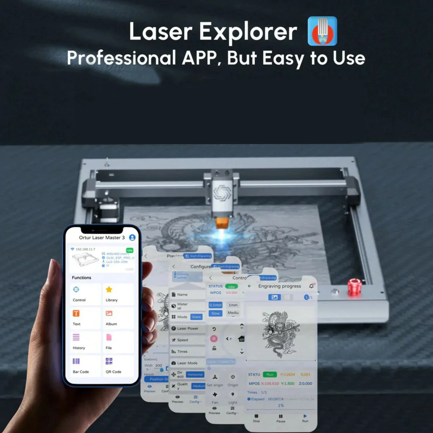 Kompatibilis számos gravírozószoftverrel, beleértve a LaserGRBL-t és a LightBurnt. Támogatja a Windows XP/7/8/XP/10 és Mac rendszereket (LightBurn), és a gravírozási fájlformátumok közé tartozik az NC, BMP, JPG, PNG, DXF. TF kártya olvasót és USB portot is találtok rajta. A Laser Explorer Professional applikáció segítségével könnyen kezelhetitek akár mobilról is, kompatibilis iPhone, Android telefonokkal, tehát bármikor és bárhol gravírozhattok.