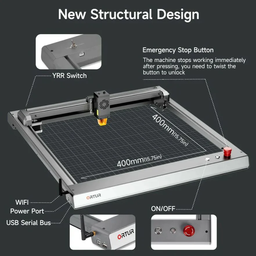 Az X/Y tengelyt szíjfeszítéssel látták el a könnyebb szíjbeállítás érdekében, így könnyebb a kábelkezelés is. Használata biztonságos, a lángérzékelő riasztórendszer lehetővé teszi a gravírozás azonnali leállítását, ha baj történne. A lézerfej automatikusan leáll, ha a gép 15 foknál jobban megdől, megbillen vagy leesik, ezenkívül a biztonsági burkolat hatékonyan védi a szemeteket az ultraibolya sugarak 97%-ának kiszűrésével.