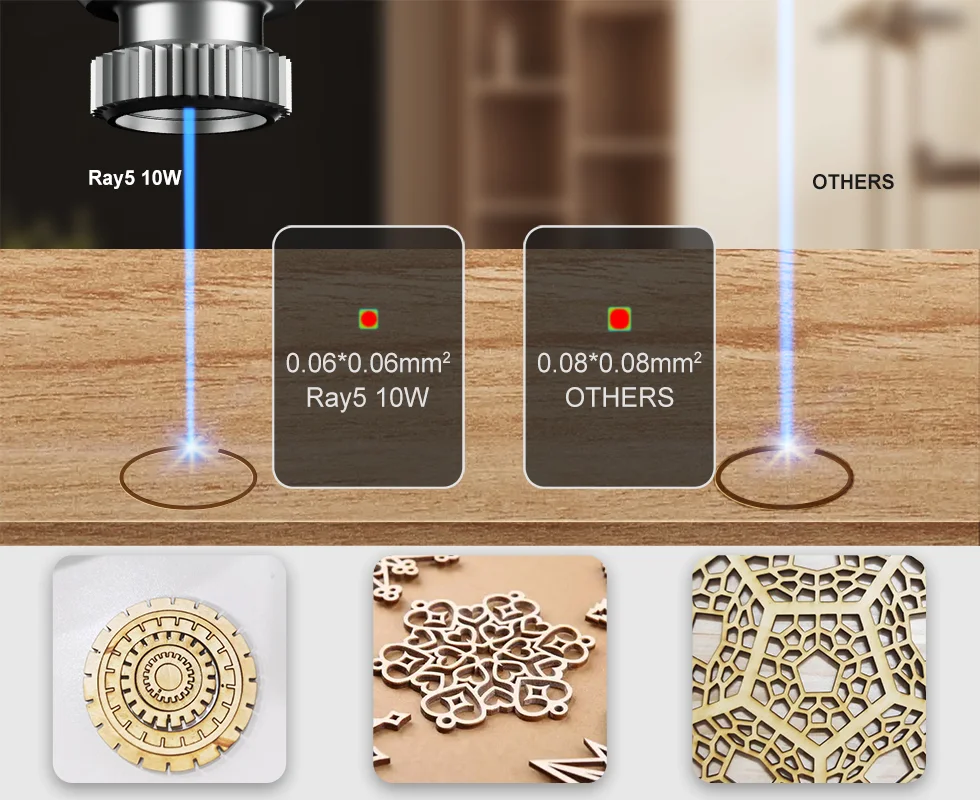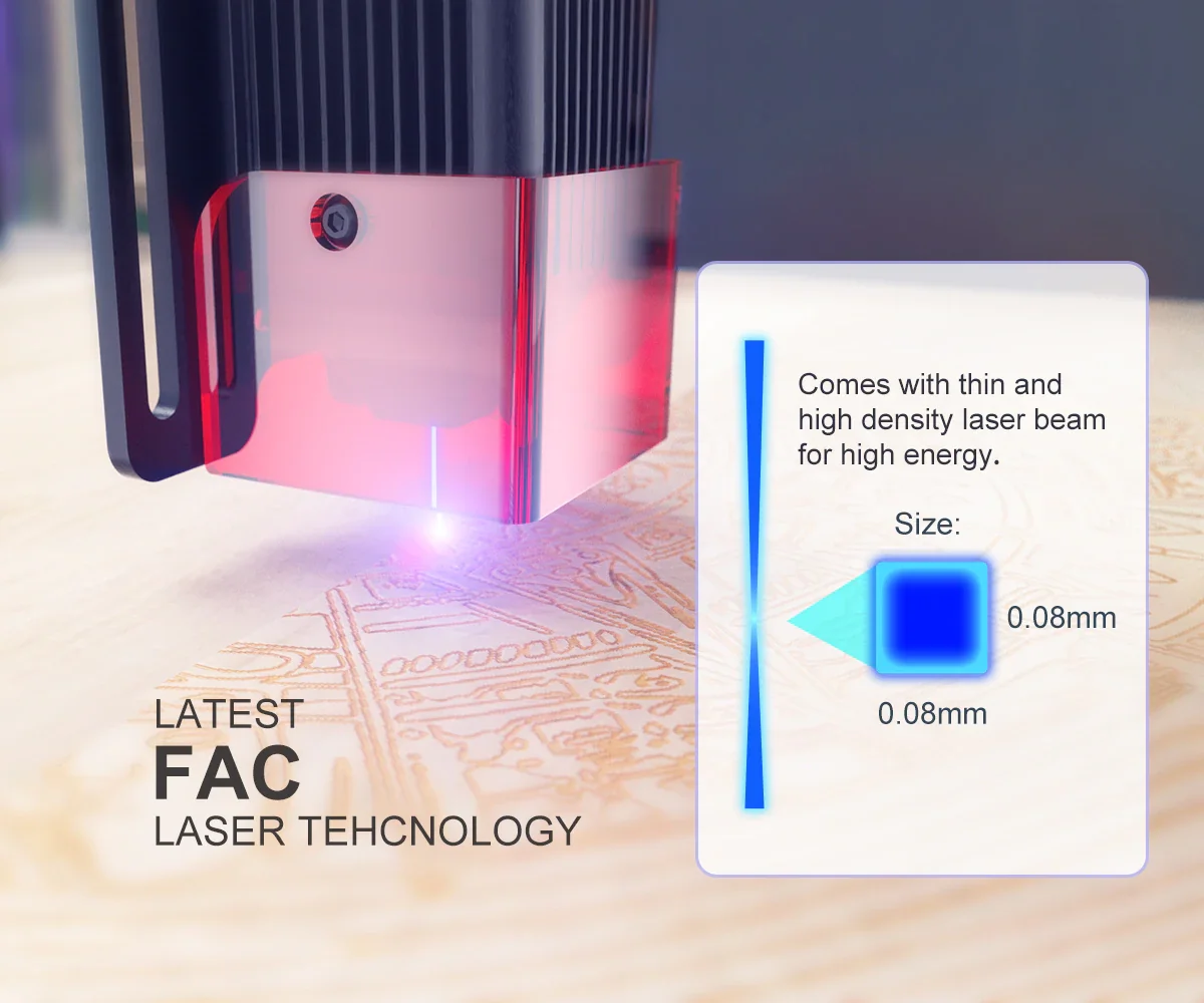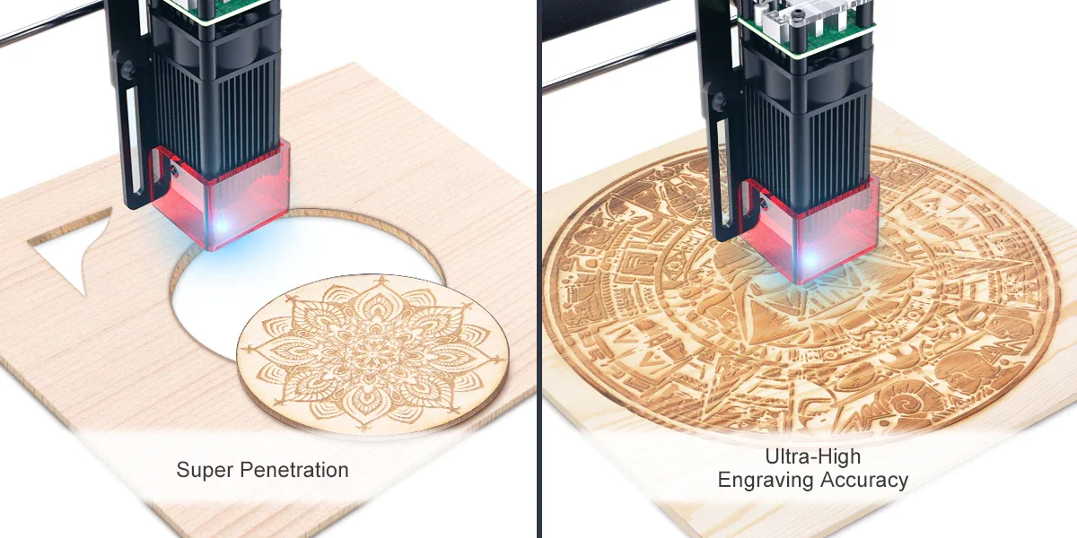 Az eszköz felhasználási területe szintén nagyon széles, használható minden anyagon, amiken az előde, de mivel ennek már megnövelt a teljesítménye, már vastagabb matériákkal is elboldogul, például könnyedén átvágja az akár 12 mm vastag fát is. Az új eszköz 10 wattos lézere ráadásul a korábban megszokott 0,08×0,08 mm helyett 0,06×0,06 mm-es ponton dolgozik, így sokkal pontosabb és vékonyabb vonalakat képes „égetni”. Az LCD kijelző itt is adott, így laptop, vagy számítógép nélkül is lehet vele dolgozni, illetve már a mobiltelefonotokról is tudjátok vezérelni, pár kattintás és a kívánt képet már el is kezdi gravírozni a masina.