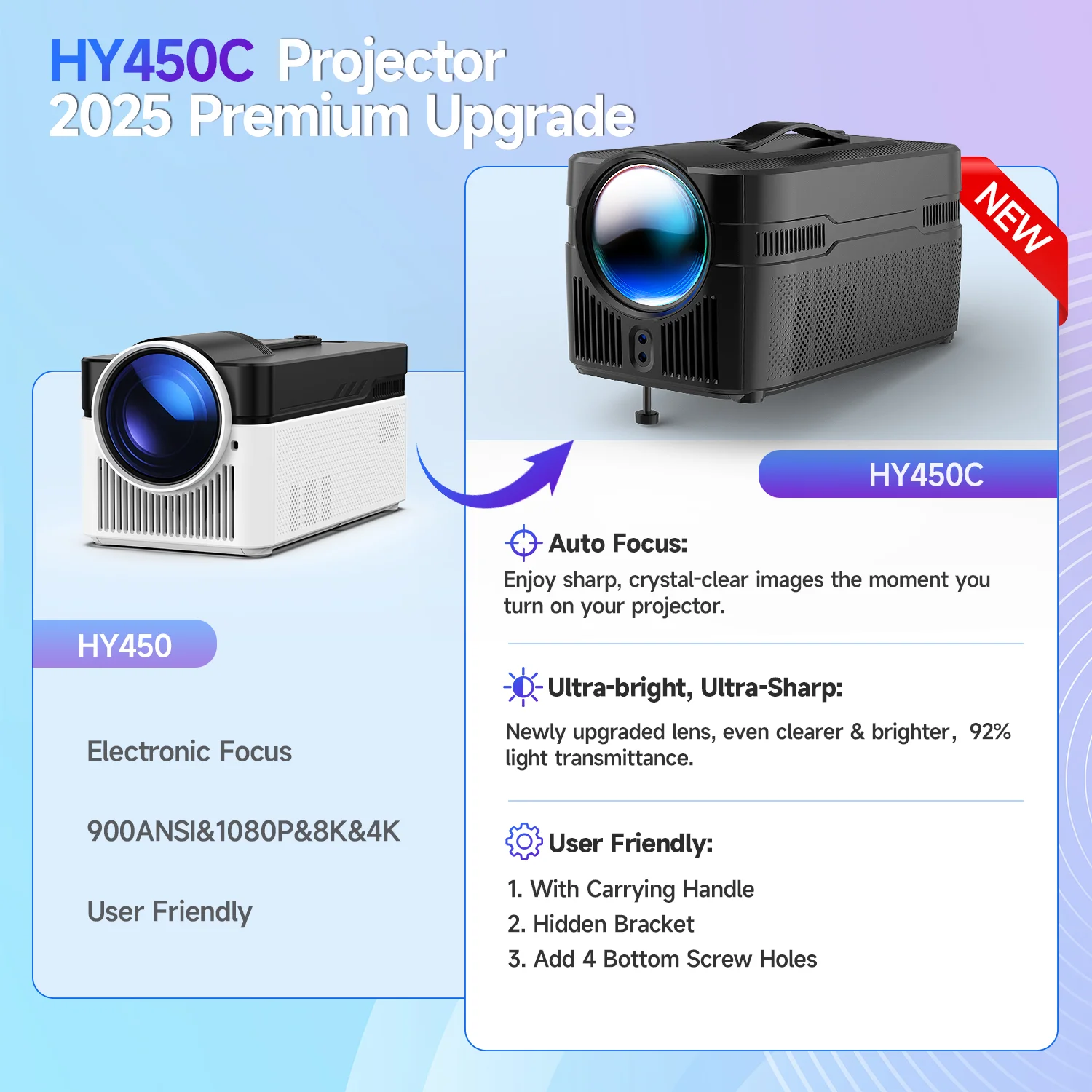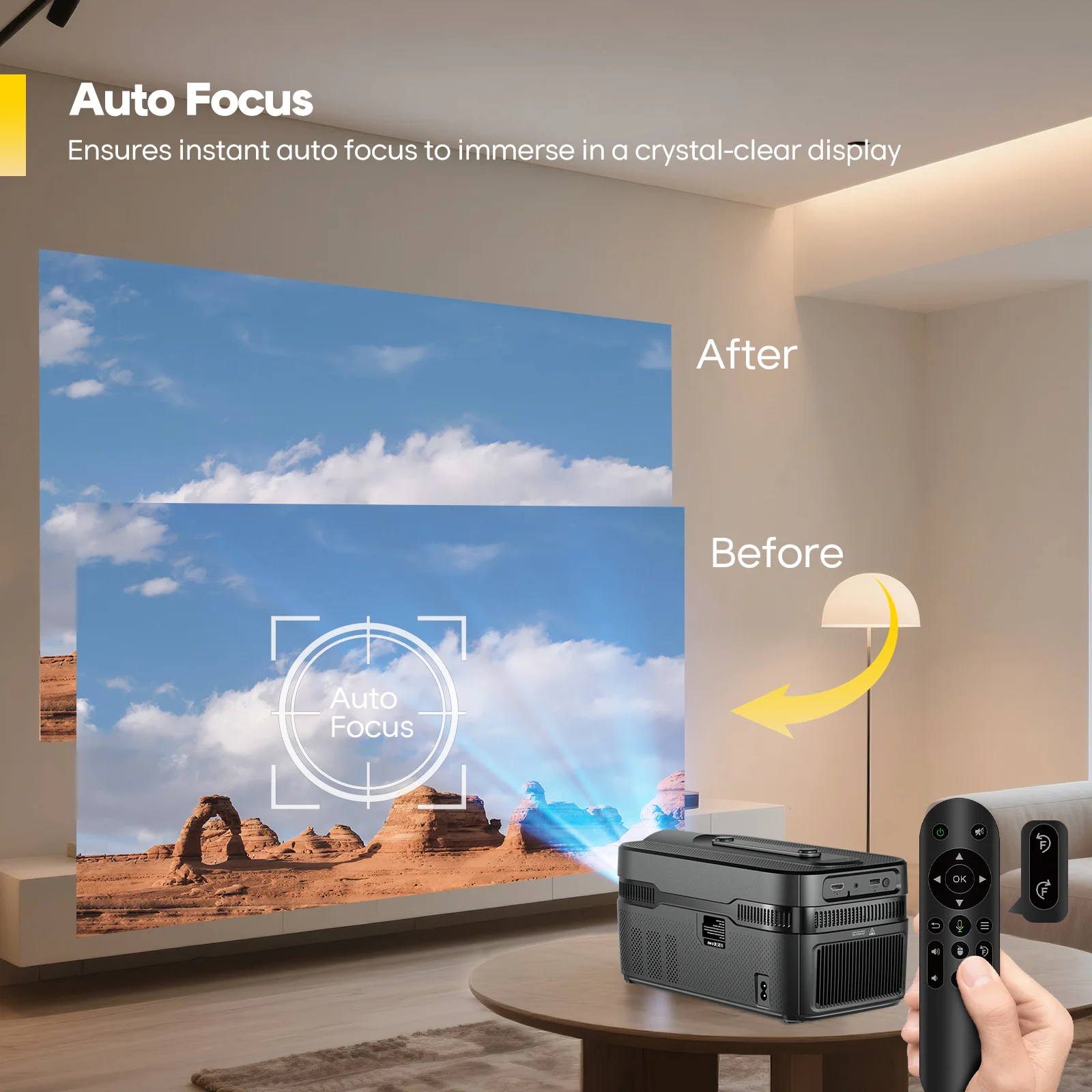 A fókuszálás mostantól teljesen automatikus: a projektor autofókuszt használ, így pár másodperc alatt tűéles képet ad, manuális tekergetés nélkül. Ehhez társul az automata trapézkorrekció, ami kiegyenesíti a ferde vetítést – magyarán elég csak nagyjából a fal felé fordítani, és a kép máris pontos lesz. Hangzás terén sincs szégyenkezni valója: a beépített kettő darab 5 W-os HiFi hangszóró meglepően telt, részletes hangot ad. Akinek ez nem elég, az Bluetooth-on keresztül csatlakoztathat külső hangrendszert is, hiszen a HY450C már a Bluetooth 5.4 szabványt használja, ami stabil és gyors kapcsolatot biztosít. A WiFi 6 támogatás garantálja a gyors és akadozásmentes adatátvitelt, akár filmeket streamelsz, akár a telefonod képét tükrözöd. A képernyőtükrözés egyébként iOS, Android és Windows eszközökkel is működik, így tényleg bármilyen forrásból megoldható a vetítés.