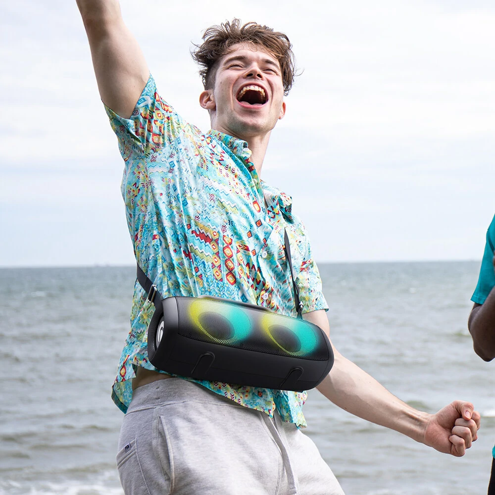 Vezérelni hagyományos gombokkal lehet, ezek a tetején kaptak helyet és a szokásos kapcsolók mellé befért egy basszuskiemelő is, amit megnyomva kicsit jobban a bulira hangolhatjuk a hangszórót. 4500 mAh kapacitású akkumulátor van benne, amivel nagyjából 10 órán keresztül folyamatosan tud üzemelni. Bluetooth 5.1-en keresztül lehet vezeték nélkül rácsatlakozni, és TWS módra is képes, tehát két ugyanilyen hangszóró összepárosítható, és képesek sztereóban szólni. Elég látványos RGB fényeket tettek rá, amik tényleg jól néznek ki, de szerencsére ki is kapcsolhatók, ha zavarna vagy éppenséggel spórolni szeretnénk az üzemidővel.