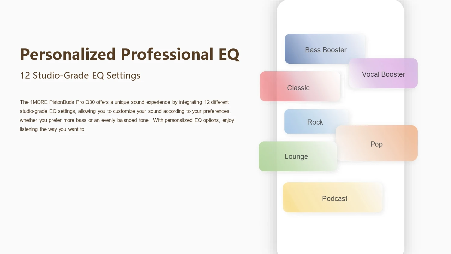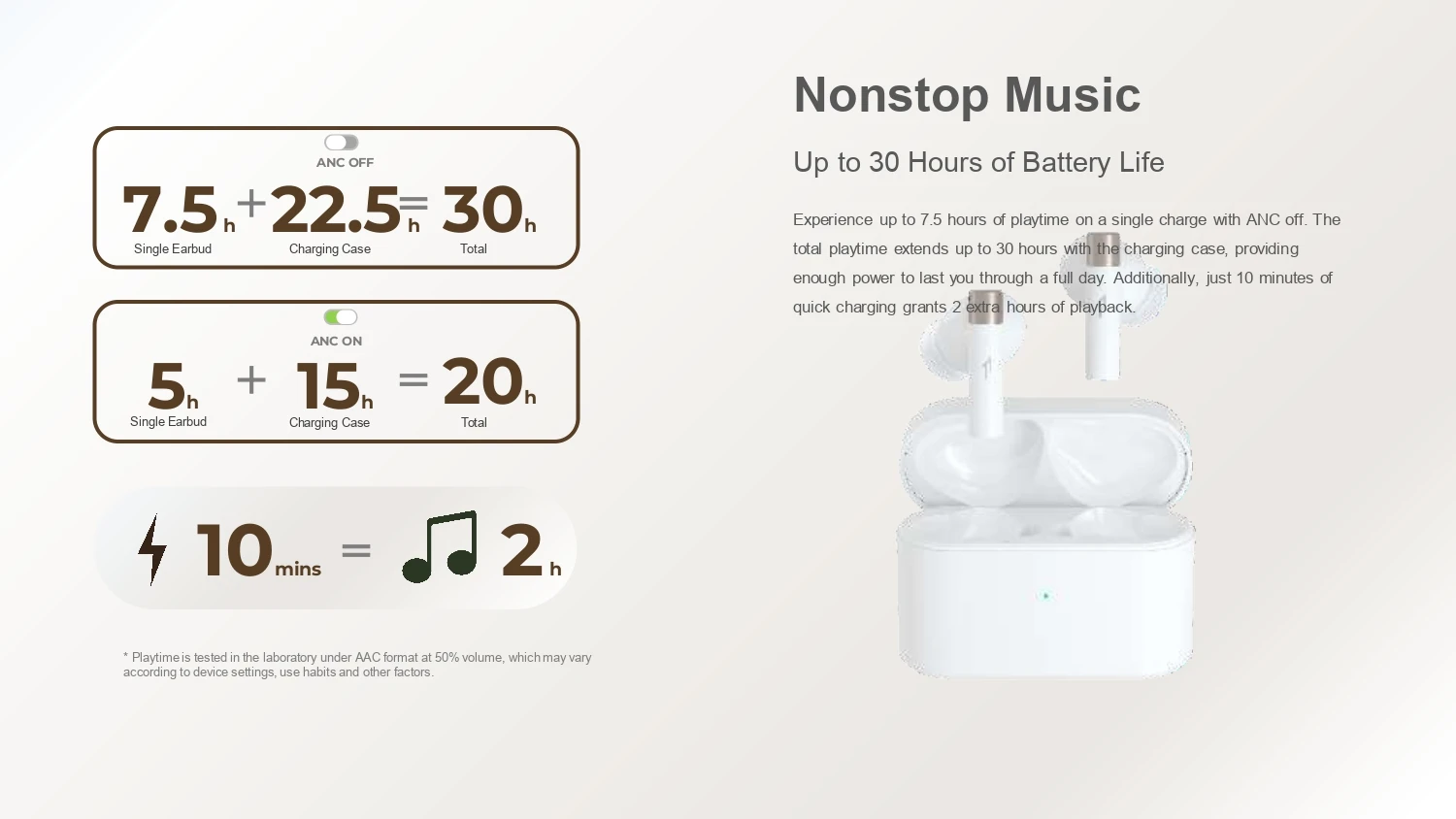 Az érintéssel vezérelhető PistonBuds Pro Q30 Bluetooth 5.3-as szabványon keresztül kommunikál, aminek köszönhetően egy töltéssel 7,5 órát lehet vele zenét hallgatni kikapcsolt, míg 5 órát bekapcsolt ANC-vel. A töltőbölcső további 22,5 vagy 15 óra üzemidőt biztosít a füleseknek használattól függően, illetve elérhető gyorstöltés is, így 10 perc alatt 2 órára elég elektron pumpálható beléjük.