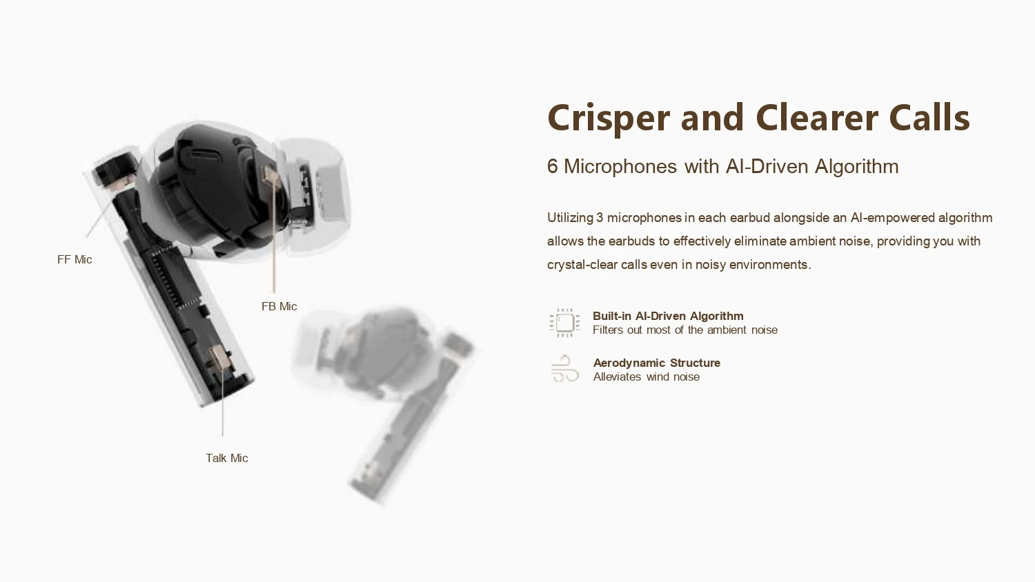Mikrofonból is rendelkezik fél tucattal a két bogyó, amelyek hatékonyan, egy AI-t is használó algoritmussal szűrik ki a háttérzajokat és jelentősen csökkentik a beszélgetésbe beszűrődő szélzajt is, ami gyakran komoly probléma az ilyen fülhallgatóknál.