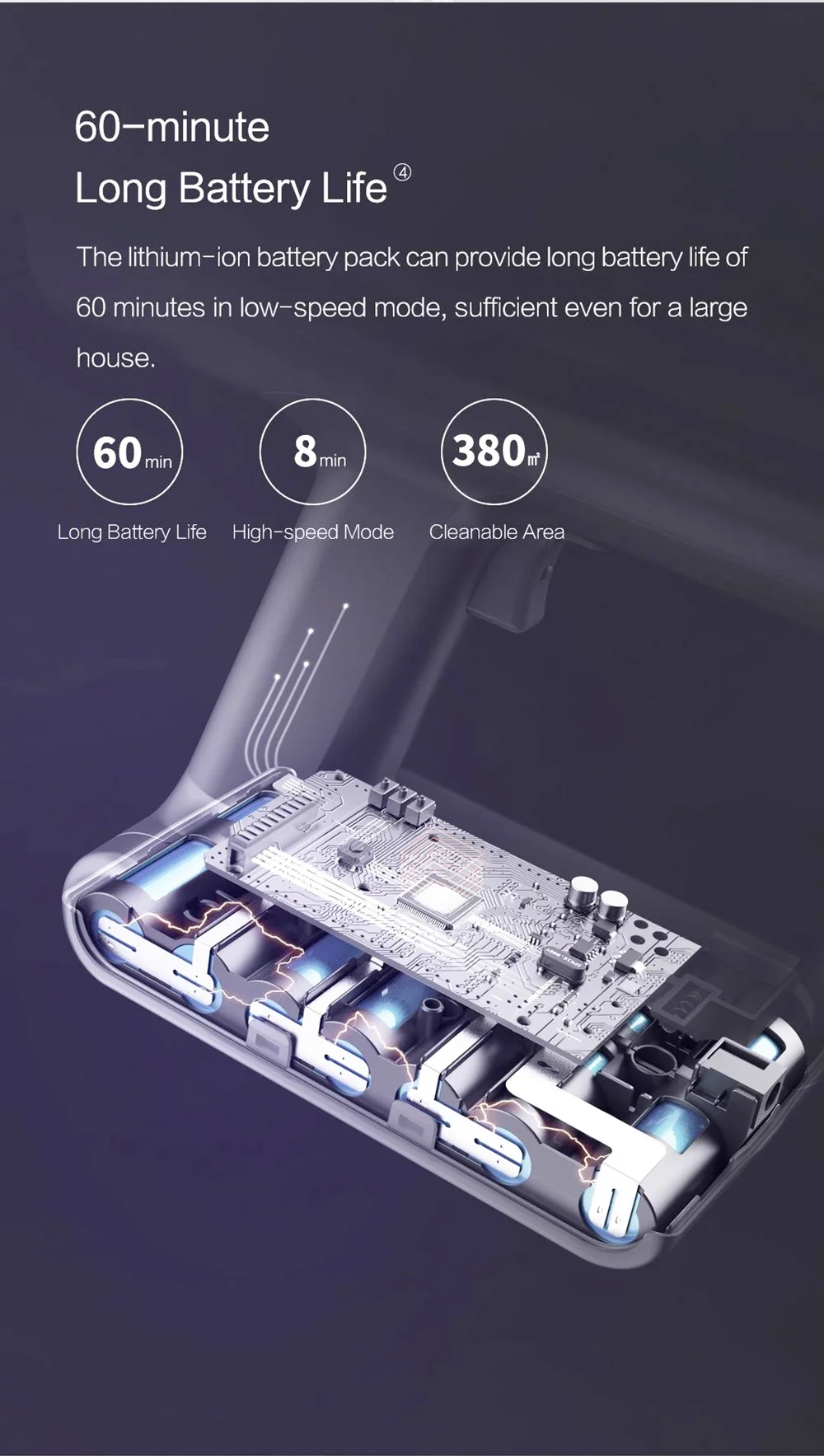 Ezen tulajdonsága kifejezetten a felső kategória jellemzője, hasonlót a Roborock H6 tud. Az akkumulátora 7 darab 2500 mAh-s cellából áll, amivel akár 60 percet is takaríthatunk egyhuzamban, és gyorscsatlakozóval cserélhető is.