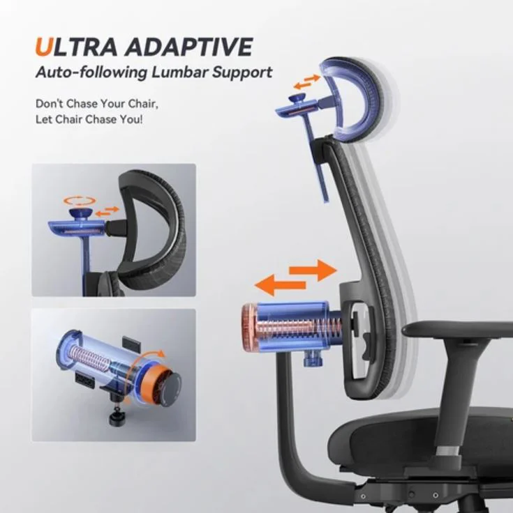 Deréktámasszal, lábtartóval, légáteresztő háttámlával, állítható kar-, hát- és fejtámlával