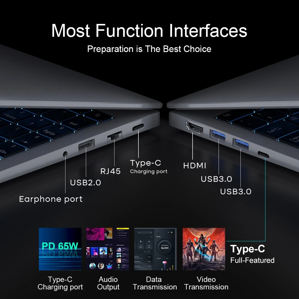 Kapcsolatok terén sem fogsz hiányt szenvedni: van 1×USB 2.0, 2×USB 3.0, 1×HDMI, 1×teljes funkcionalitású Type-C, 1×csak töltésre használható Type-C, RJ45-ös LAN port, 3,5 mm-es jack, és még WiFi 6 meg Bluetooth 5.0 is jár a csomaghoz. Komolyabb melóra vagy hálózatos munkára is fel van készítve.