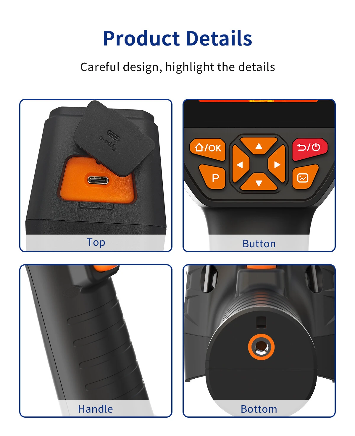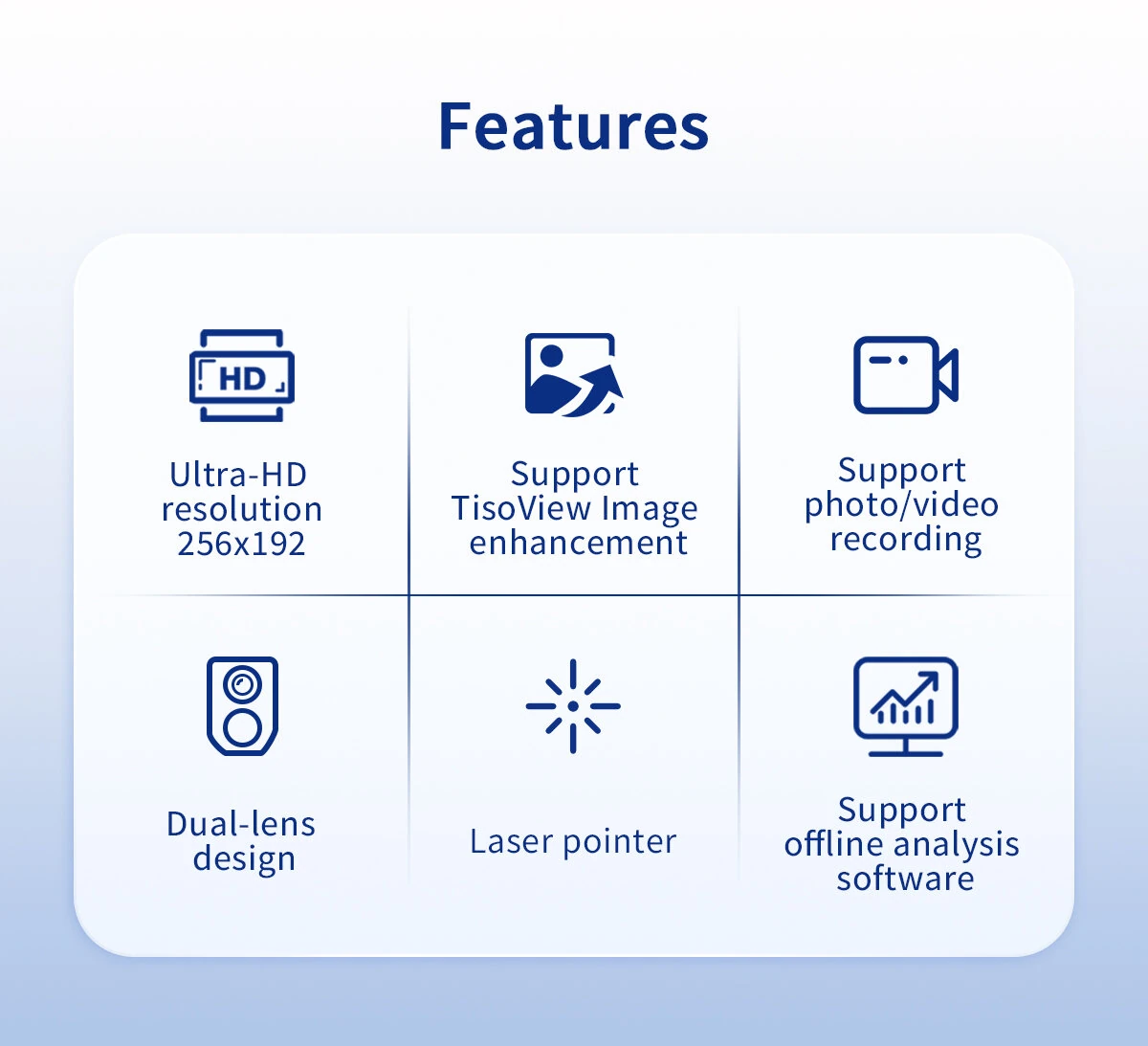 A használhatóságot számos intelligens funkció teszi teljessé: a készülékek automatikusan jelzik a legmelegebb és leghidegebb pontokat, de lehetőség van középponti vagy egy adott régióra korlátozott mérésre is. A vizuális elemzést hét különböző színpaletta – például az Iron, a Rainbow vagy a High Contrast – segíti, hogy minden környezetben a legkontrasztosabb képet kapjuk. A kényelmet fokozza a modern USB Type-C csatlakozó, a sötét helyeket bevilágító LED fény, valamint a tájékozódást segítő lézeres mutató is. Az elvégzett munkát nem kell azonnal menteni, hiszen a 8 GB-os beépített memória (6,19 GB valós tárhely) több mint 20 000 kép tárolására alkalmas, a többnyelvű menürendszer pedig gondoskodik róla, hogy a beállítások módosítása bárki számára gyerekjáték legyen.