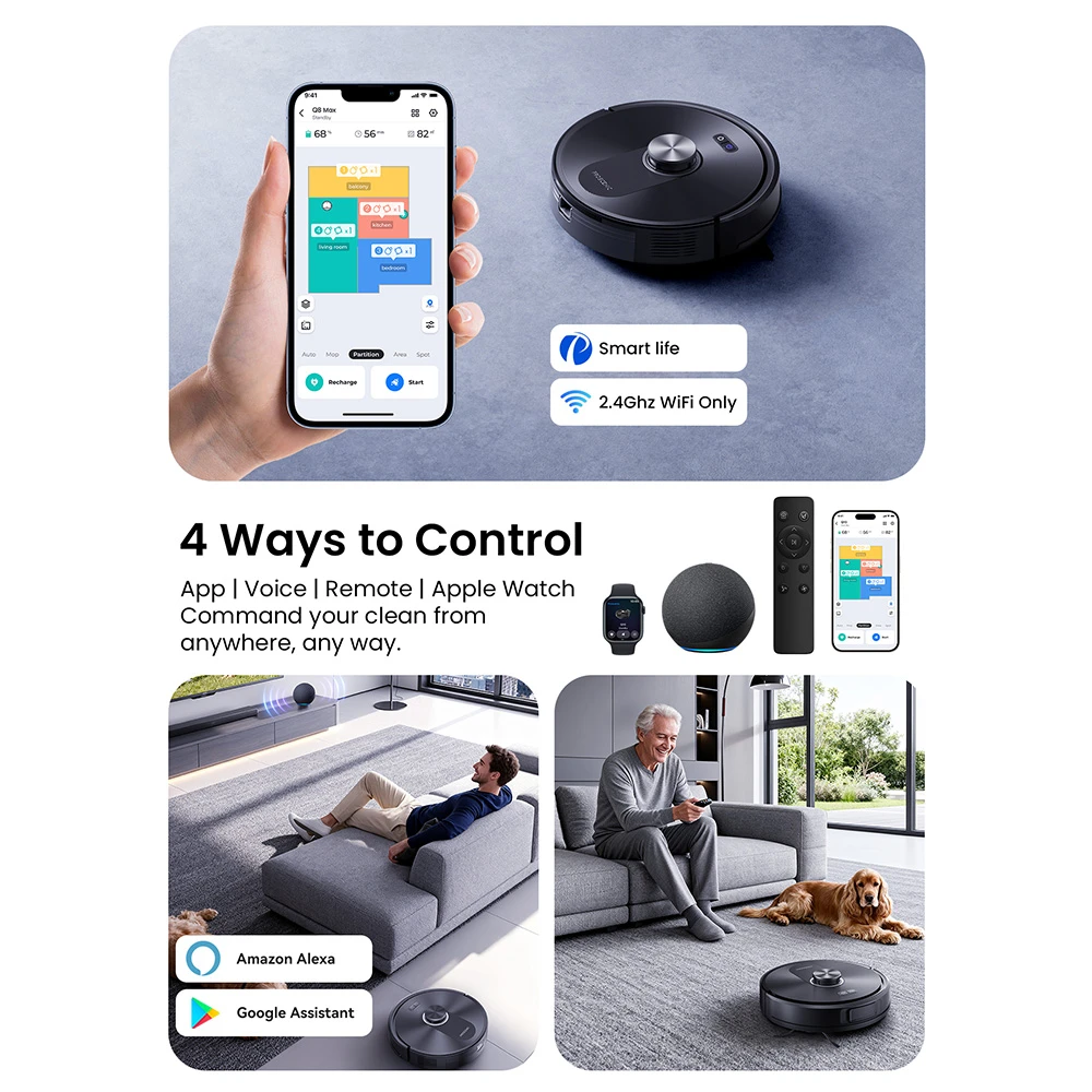 A vezérlés pedig szintén a kényelemről szól: használhatod a telefonos applikációval (Proscenic Home), adhatod ki az utasításokat Alexa vagy Google Assistant hangparancson keresztül, vagy nyomkodhatod a mellékelt távirányítót, sőt, még Apple Watch-ról is indíthatod a takarítást. Műszaki oldalról nézve is szépen mutat: három fokozatban állítható szívóerő (Eco, Standard, Max), szőnyegérzékelős Carpet Boost funkció, 2 cm küszöbmászó képesség, ≤ 64 dB zajszint, mindössze 9,7 cm magas test, 30,6×30,6 cm-es alapterület, és mindössze 2,5 kg súly. A töltési idő kevesebb mint 6 óra, és a dobozban minden szükséges kiegészítőt megtalálsz: HEPA szűrőket, oldalkeféket, felmosókat, távirányítót, takarítókefét és persze egy használati útmutatót is.