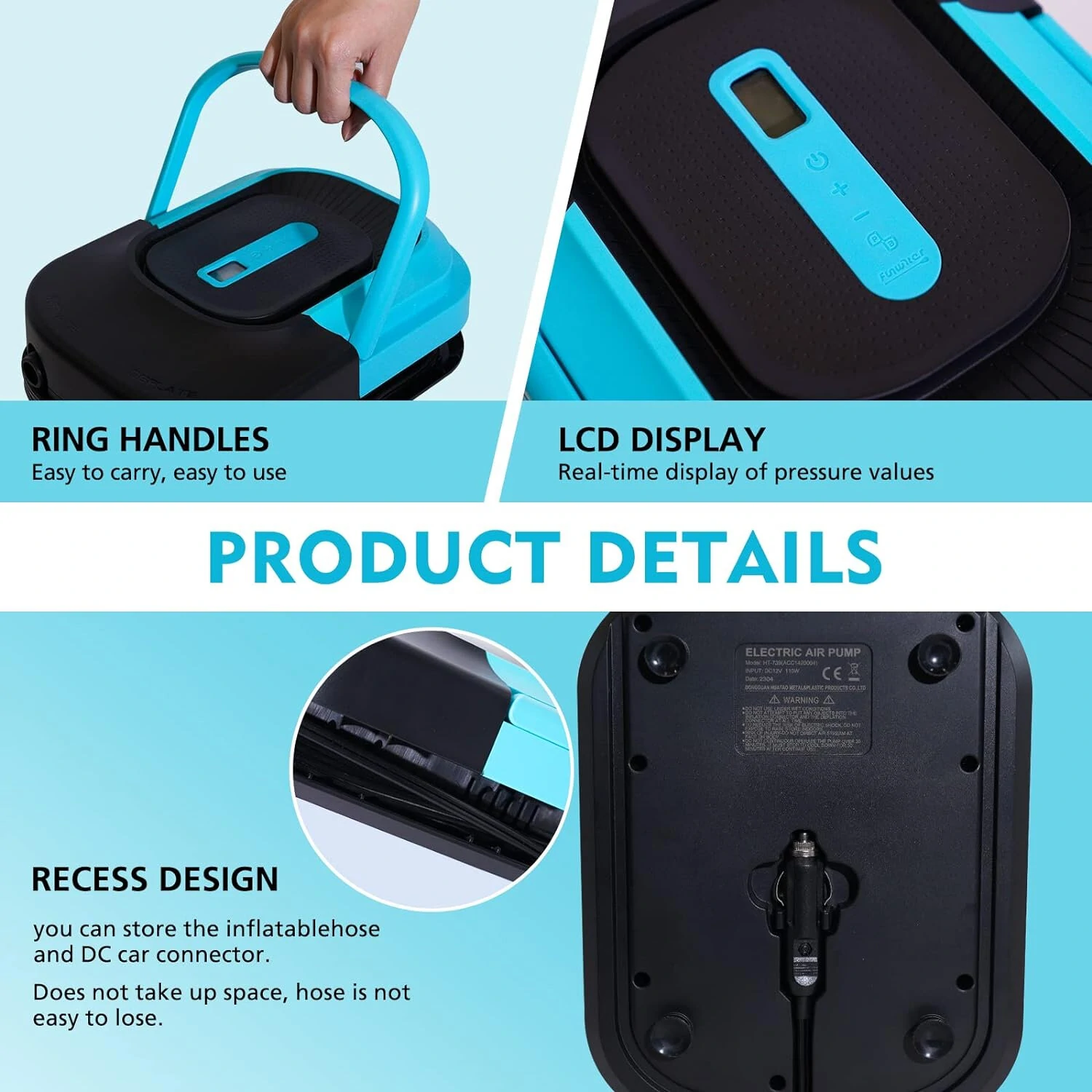 Az okos funkciók sem maradtak ki: intelligens automata kikapcsolás gondoskodik arról, hogy a pumpa leálljon, amikor eléri a beállított nyomást. Közben a háttérvilágítással ellátott kijelzőn figyelemmel kísérheted a nyomás alakulását – szóval még naplementében is könnyen használható. Méretei kompaktak: 28,5×21×10 cm, így simán befér a kocsi csomagtartójába, és a kényelmes fogantyúval könnyű is cipelni. Az anyaga strapabíró műanyag, a színe pedig egy üde kék, amit nem fogsz eltéveszteni a parton. A zajszintje maximum 85 dB, így ugyan nem suttogva dolgozik, de bőven elviselhető, főleg cserébe a gyors felfújásért. A működéshez DC 12V–14,4V feszültség kell, tehát simán üzemeltethető az autód szivargyújtójáról.