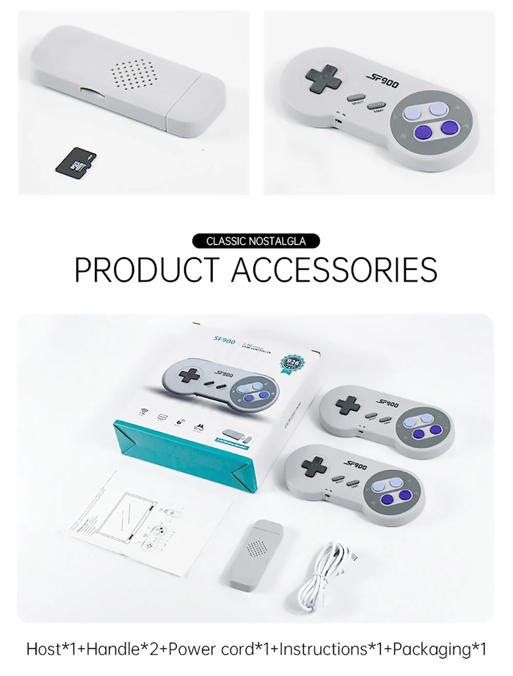 Az SF900 három részből tevődik össze, egy TV stickre emlékeztető, HDMI csatlakozós fő egységből és két darab kontrollerből. Gyárilag 926 játékot telepítettek rá, de ezek között minden bizonnyal azért vannak közel azonosak is. Az irányítók egyetlen AAA elemmel működnek, aminek segítségével a gyártó által megadott adatok alapján 35 óráig is képesek üzemelni.