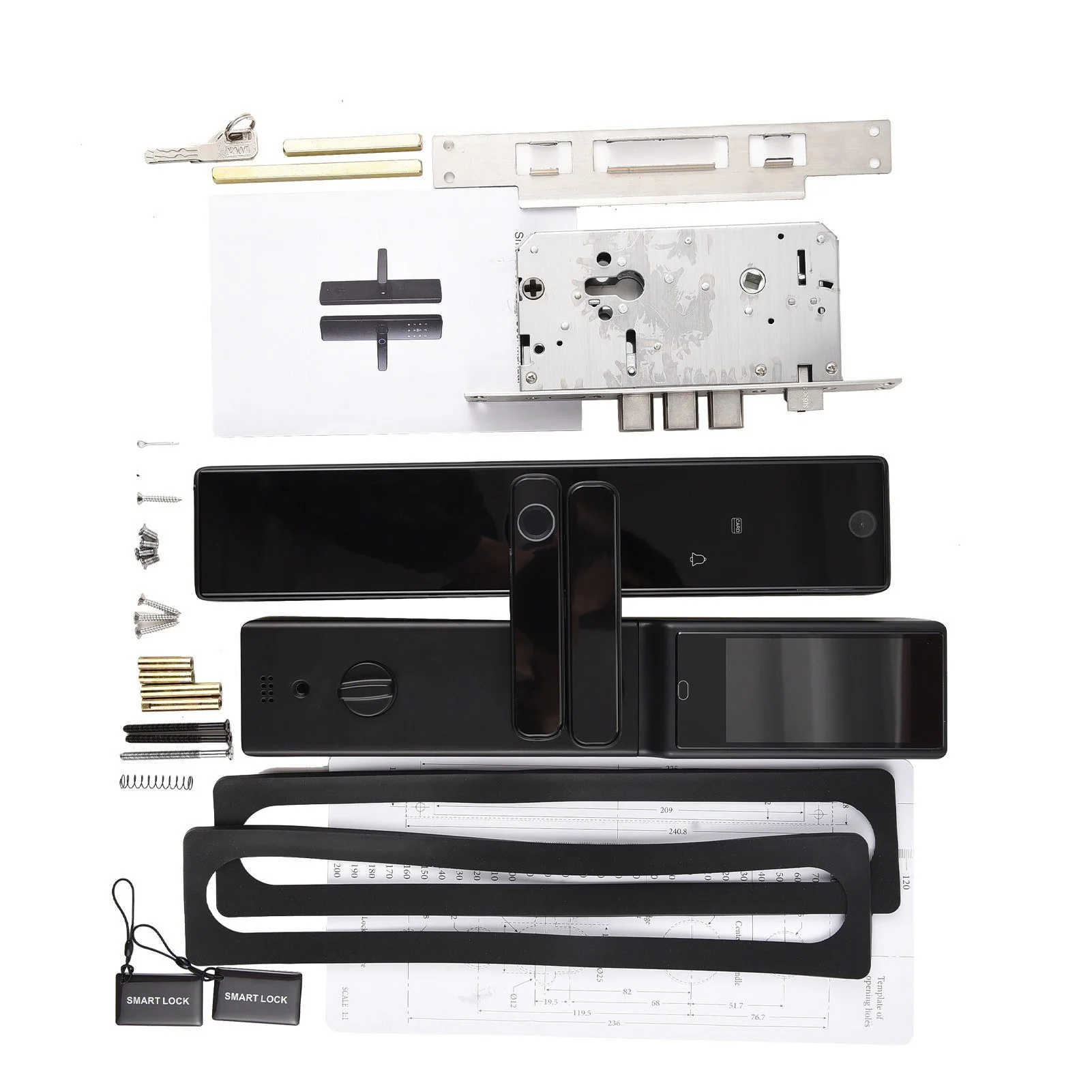 Előlap, hátlap, zártest, rögzítő lemezek, védőburkolat, 2 IC kártya, 2 kulcs, csavarok, furatsablon, és persze a kötelező kézikönyv.