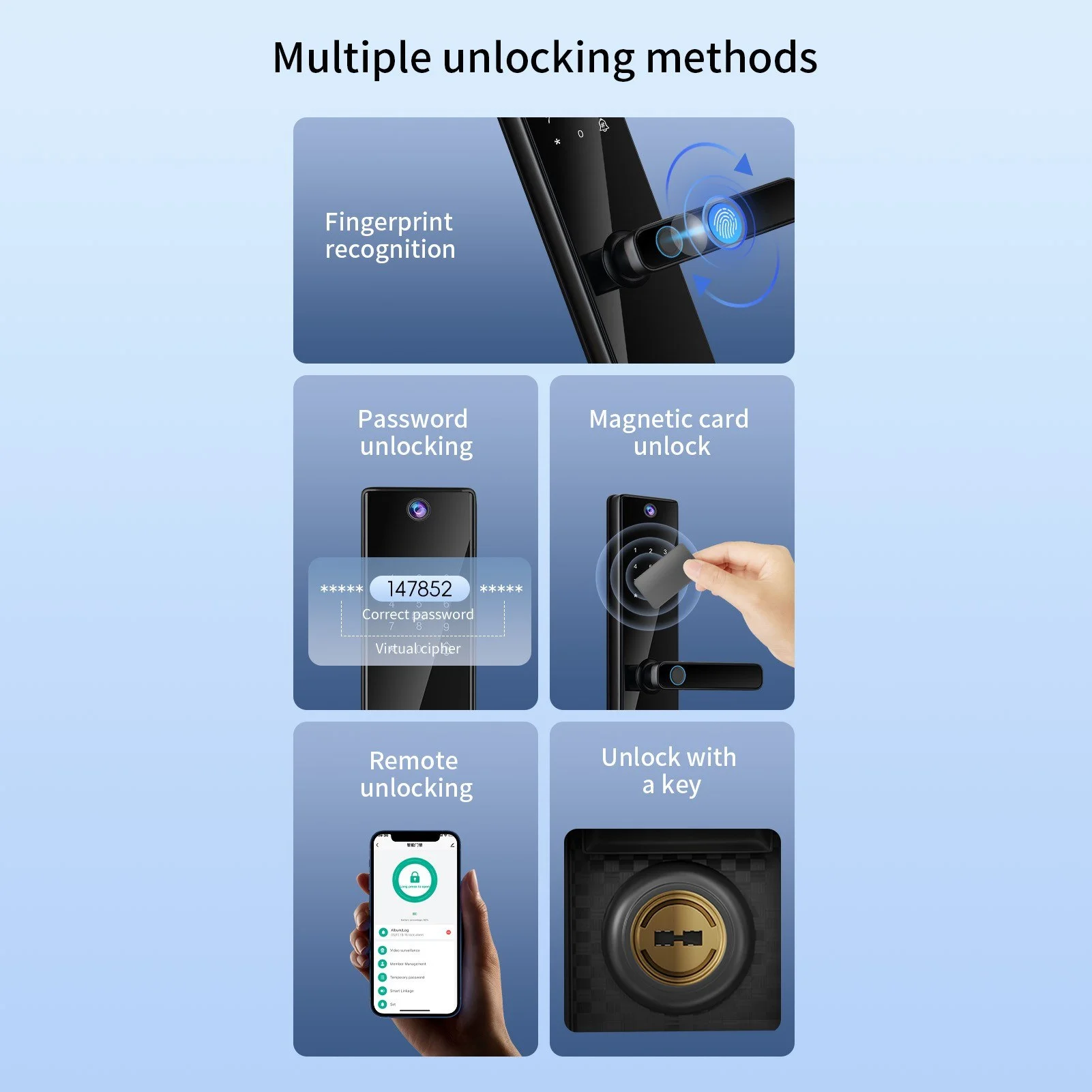 A kulcs elavult. Túl könnyen elhagyod, lemásolják, vagy simán nem nálad van. Ehelyett itt a 6-féle nyitási módot kínáló intelligens zár, ami pontosan tudja, ki vagy – és mikor akarsz bejutni. Ujjlenyomat? Oké. Jelszó? Jöhet. IC kártya? Működik. Távoli nyitás appból? Simán. Mechanikus kulcs vészhelyzet esetén? Természetesen. Mindezt 5 másodperces azonosítási sebességgel, 0,001% alatti téves felismeréssel.