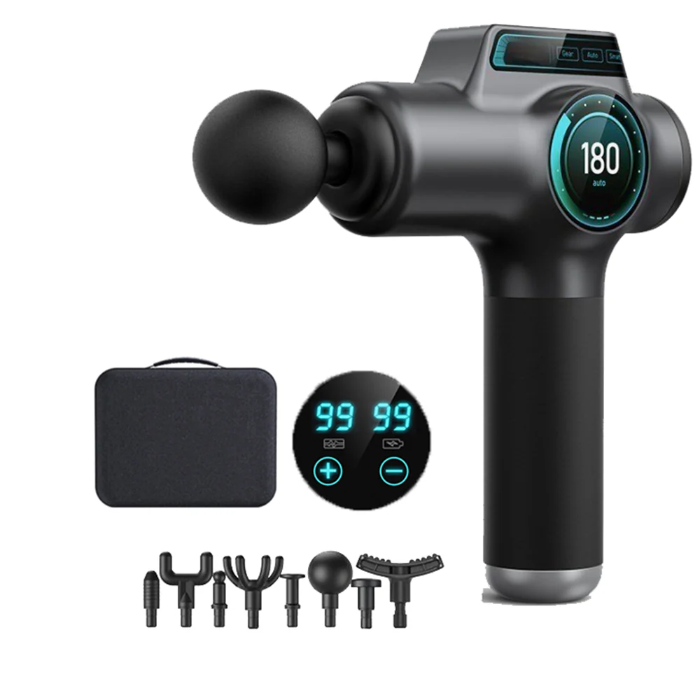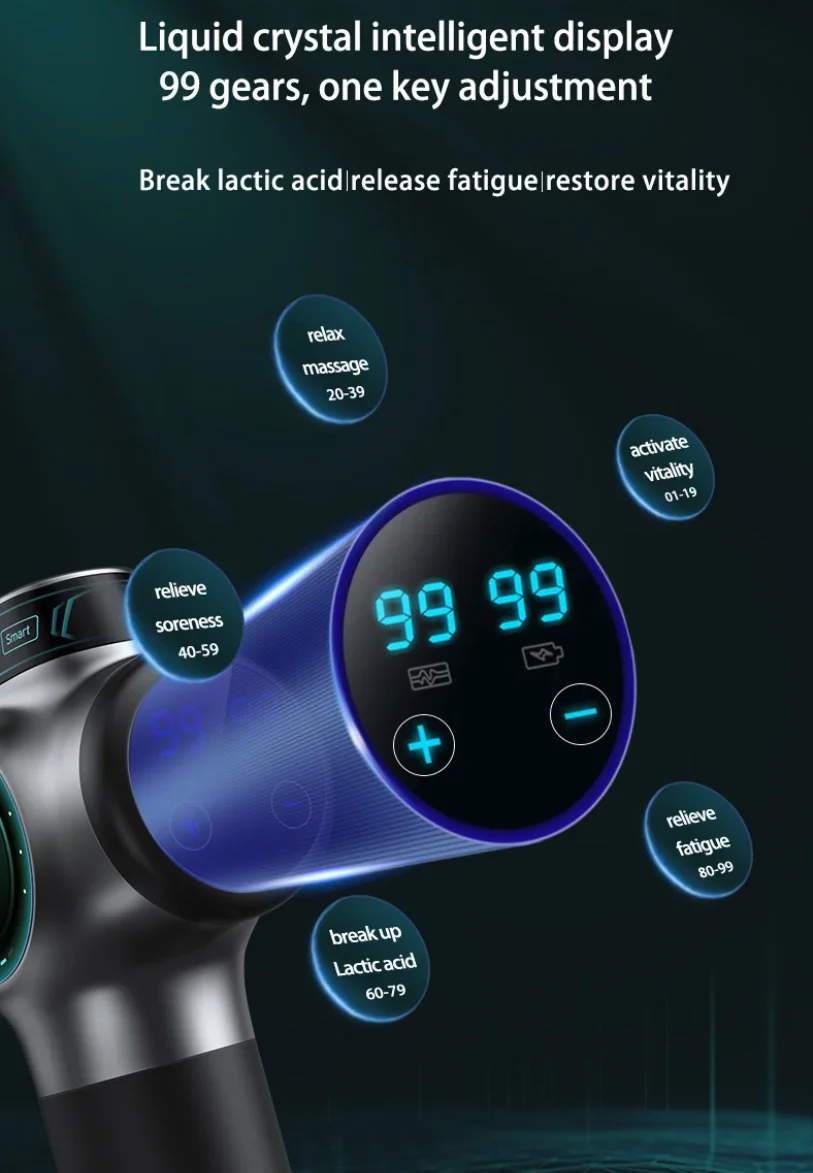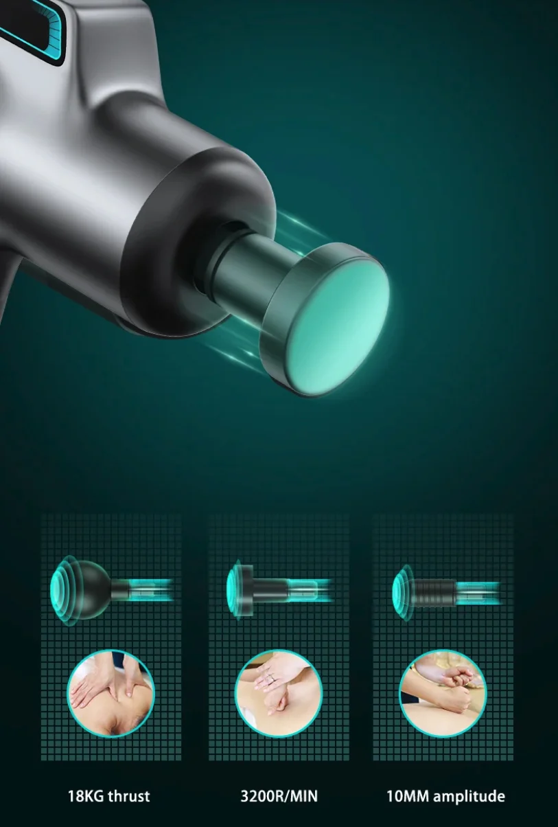 Az A1-8D egy 1 kilogramm tömegű műanyag pisztoly, ami nagyon könnyedén kezelhető. A masszírozófejjel ellentétes oldalán van egy kis kijelzője, itt tudod állítani mind a 6 fokozatát, amik az izmok „felébresztésétől” kezdve a különböző izomfájdalmak csökkentésén át egészen a mély masszázsig variálhatók. 8 különféle fejjel érkezik, mindegyik más izomcsoporthoz ajánlott.